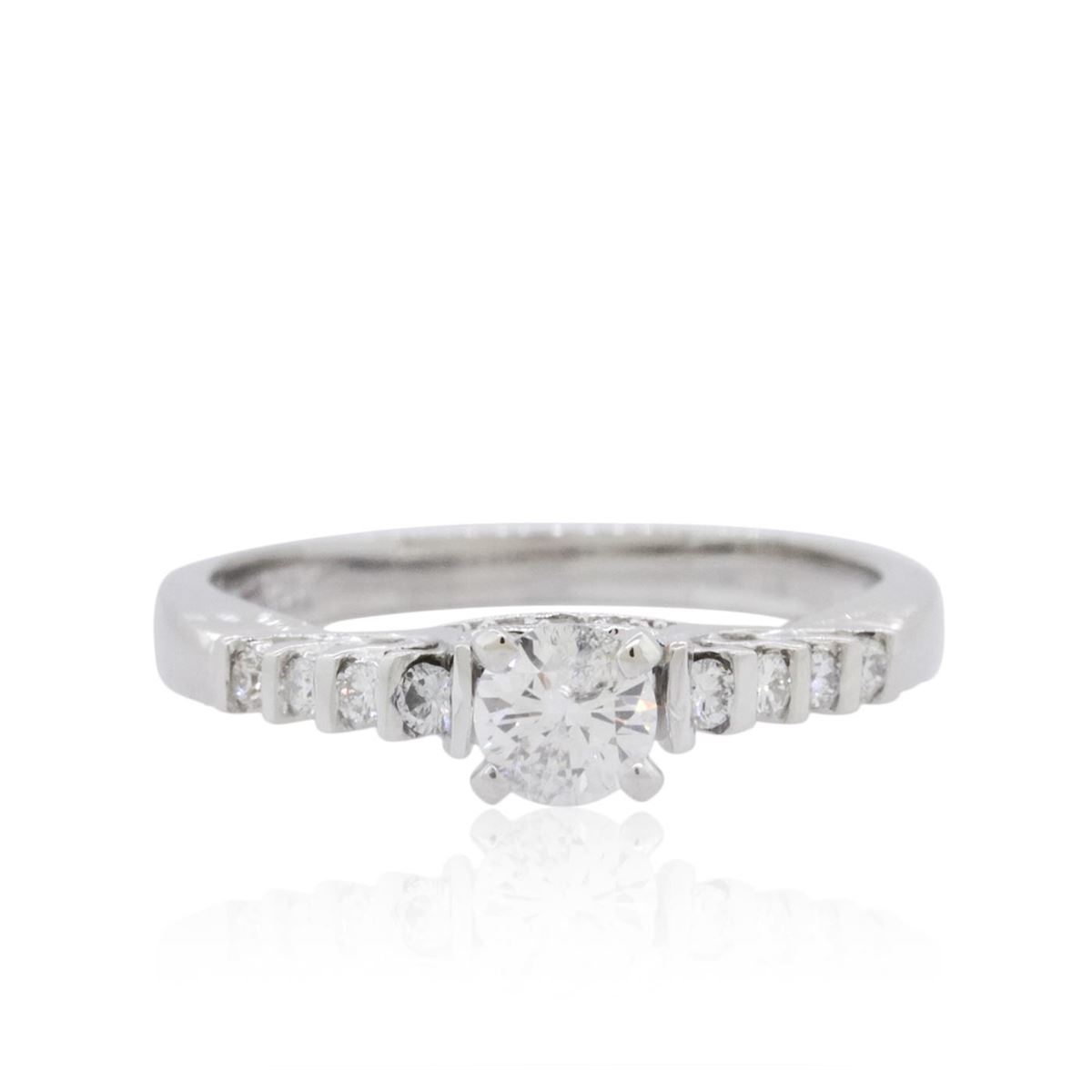One ring featuring: 14KT white gold weighing 2.80 grams containing one prong set round cut diamond center stone with a total weight of 0.37ct and prong set round cut diamonds with a total weight of 0.18cts.