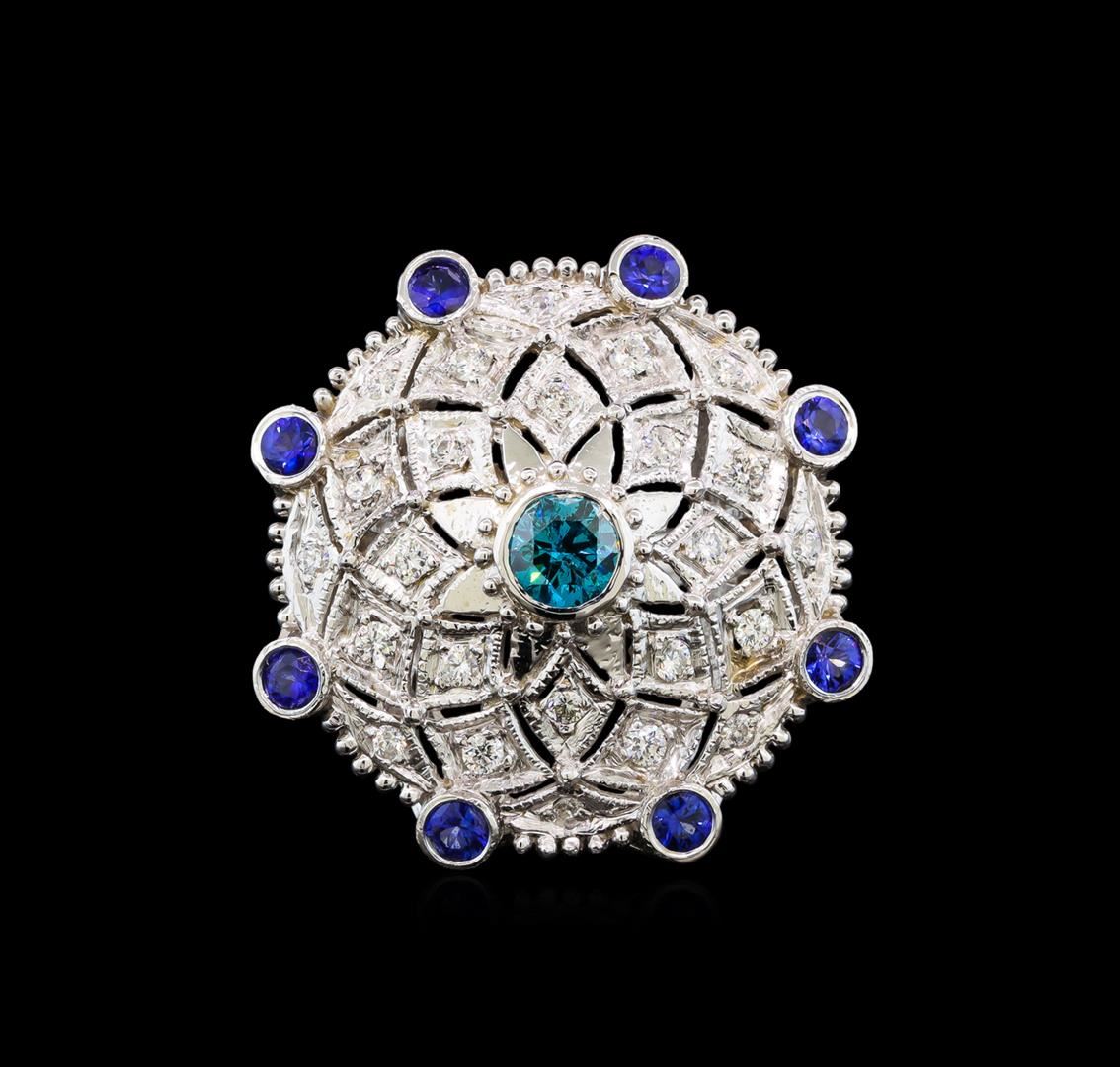One electronically tested 14KT white gold ladies cast tanzanite and diamond ring with a bright polish finish. Identified with markings of "K14". Condition is new. Containing: Eight bezel set round modified brilliant cut natural tanzanites, measuring 2.50 - 2.50 x 1.63 mm, approximate total weight of 0.56ct., clarity is slightly included, type I, medium light, very slightly grayish, violet color, (GIA V 4/3), cut is good. One bezel set round brilliant cut diamond, measuring 5.00 - 5.00 x 3.00mm (depth est.) approximate weight of 0.46ct. Clarity: I-2, Cut is Good. Color of the stone has been treated. Twenty-Four prong set round brilliant cut diamonds, measuring 1.80 - 1.80 x 1.08mm (depth est.) approximate total weight of 24 Stones = 0.51ct. Clarity: SI-1 to SI-2. Color: G - H, Cut is Good. Colored gemstones are presumed to have been subjected to commonly used enhancement processes. All diamonds and colored gemstones are graded in the mounting, unless otherwise stated. Total Weight of Colored Stones 0.56ct. Total Weight of Diamonds 0.97ct. Total Weight of Ring 9.30 grams. GGL Appraised.