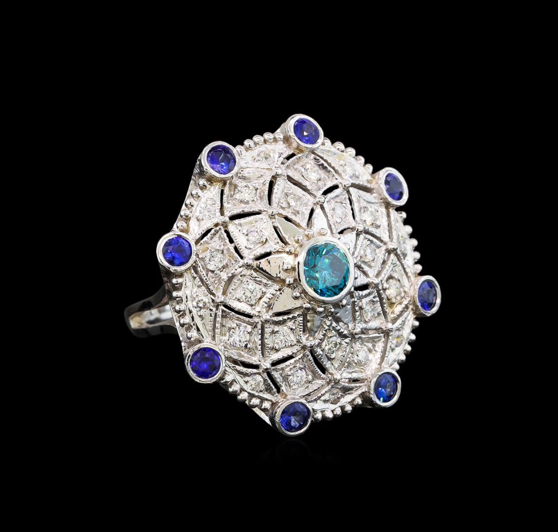 One electronically tested 14KT white gold ladies cast tanzanite and diamond ring with a bright polish finish. Identified with markings of "K14". Condition is new. Containing: Eight bezel set round modified brilliant cut natural tanzanites, measuring 2.50 - 2.50 x 1.63 mm, approximate total weight of 0.56ct., clarity is slightly included, type I, medium light, very slightly grayish, violet color, (GIA V 4/3), cut is good. One bezel set round brilliant cut diamond, measuring 5.00 - 5.00 x 3.00mm (depth est.) approximate weight of 0.46ct. Clarity: I-2, Cut is Good. Color of the stone has been treated. Twenty-Four prong set round brilliant cut diamonds, measuring 1.80 - 1.80 x 1.08mm (depth est.) approximate total weight of 24 Stones = 0.51ct. Clarity: SI-1 to SI-2. Color: G - H, Cut is Good. Colored gemstones are presumed to have been subjected to commonly used enhancement processes. All diamonds and colored gemstones are graded in the mounting, unless otherwise stated. Total Weight of Colored Stones 0.56ct. Total Weight of Diamonds 0.97ct. Total Weight of Ring 9.30 grams. GGL Appraised.