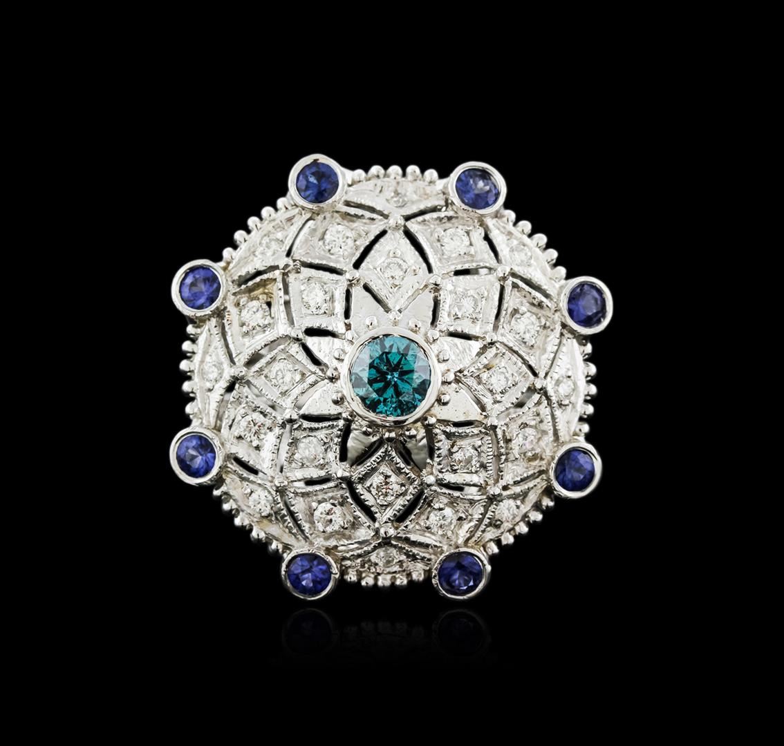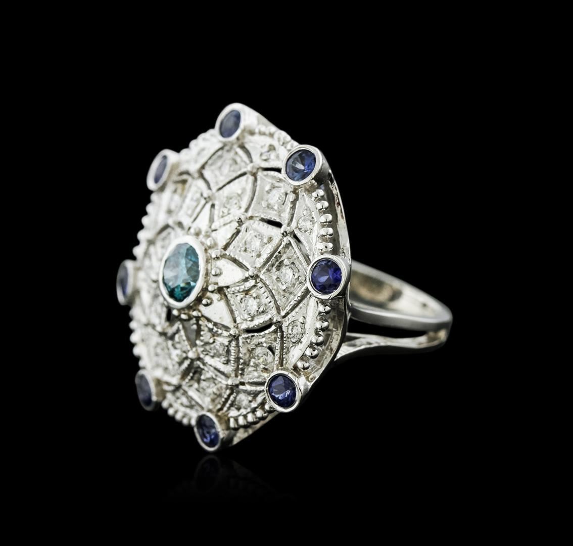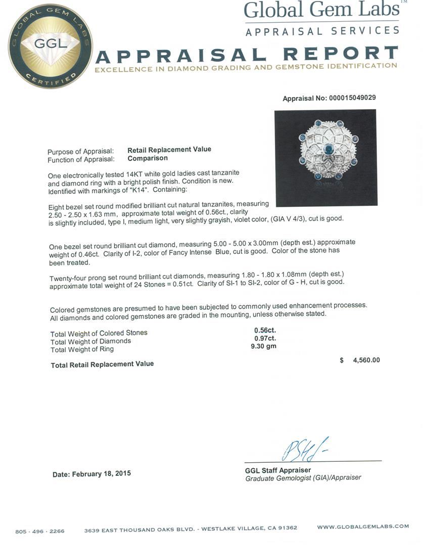 One electronically tested 14KT white gold ladies cast tanzanite and diamond ring with a bright polish finish. Identified with markings of "K14". Condition is new. Containing: Eight bezel set round modified brilliant cut natural tanzanites, measuring 2.50 - 2.50 x 1.63 mm, approximate total weight of 0.56ct., clarity is slightly included, type I, medium light, very slightly grayish, violet color, (GIA V 4/3), cut is good. One bezel set round brilliant cut diamond, measuring 5.00 - 5.00 x 3.00mm (depth est.) approximate weight of 0.46ct. Clarity: I-2, Cut is Good. Color of the stone has been treated. Twenty-Four prong set round brilliant cut diamonds, measuring 1.80 - 1.80 x 1.08mm (depth est.) approximate total weight of 24 Stones = 0.51ct. Clarity: SI-1 to SI-2. Color: G - H, Cut is Good. Colored gemstones are presumed to have been subjected to commonly used enhancement processes. All diamonds and colored gemstones are graded in the mounting, unless otherwise stated. Total Weight of Colored Stones 0.56ct. Total Weight of Diamonds 0.97ct. Total Weight of Ring 9.30 grams. GGL Appraised at $4,560.00.