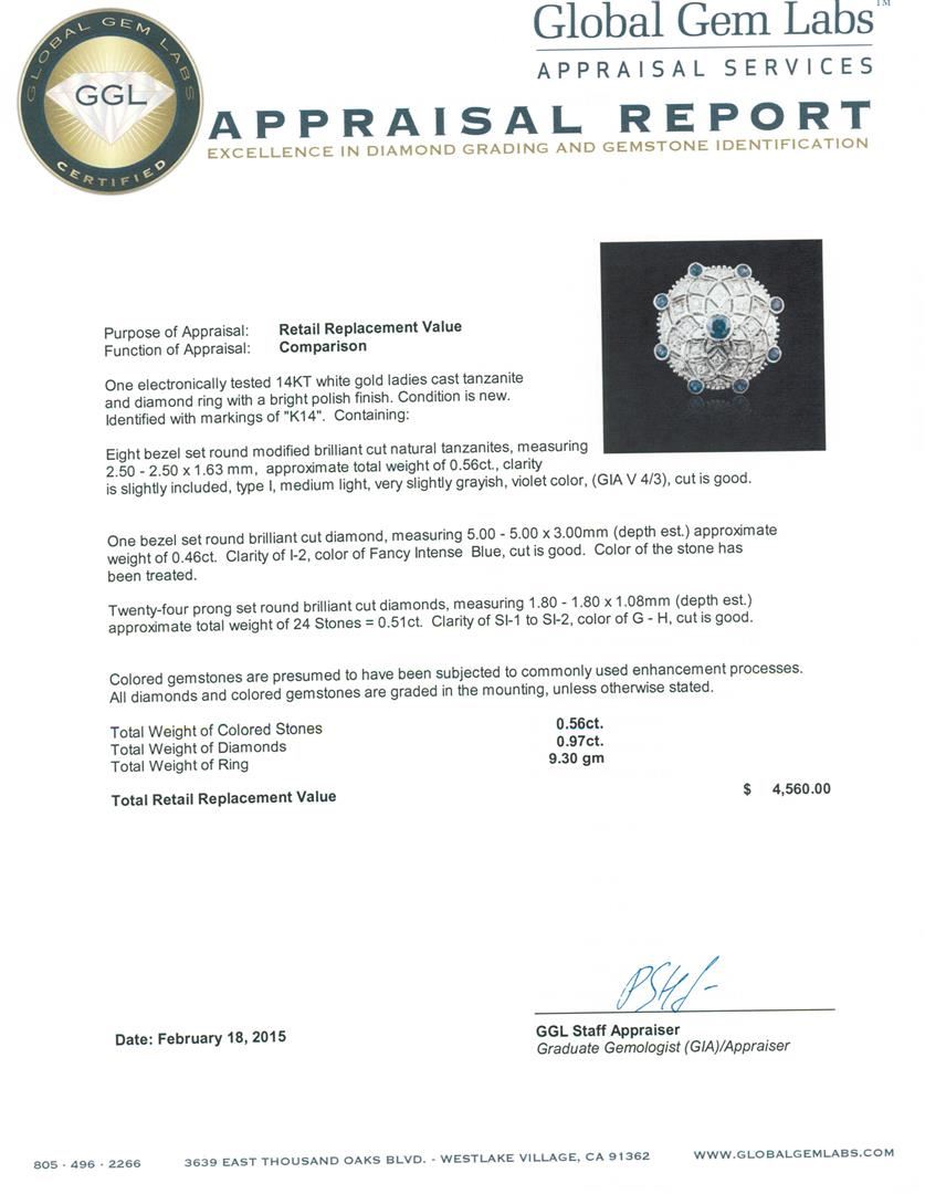 One electronically tested 14KT white gold ladies cast tanzanite and diamond ring with a bright polish finish. Identified with markings of "K14". Condition is new. Containing: Eight bezel set round modified brilliant cut natural tanzanites, measuring 2.50 - 2.50 x 1.63 mm, approximate total weight of 0.56ct., clarity is slightly included, type I, medium light, very slightly grayish, violet color, (GIA V 4/3), cut is good. One bezel set round brilliant cut diamond, measuring 5.00 - 5.00 x 3.00mm (depth est.) approximate weight of 0.46ct. Clarity: I-2, Cut is Good. Color of the stone has been treated. Twenty-Four prong set round brilliant cut diamonds, measuring 1.80 - 1.80 x 1.08mm (depth est.) approximate total weight of 24 Stones = 0.51ct. Clarity: SI-1 to SI-2. Color: G - H, Cut is Good. Colored gemstones are presumed to have been subjected to commonly used enhancement processes. All diamonds and colored gemstones are graded in the mounting, unless otherwise stated. Total Weight of Colored Stones 0.56ct. Total Weight of Diamonds 0.97ct. Total Weight of Ring 9.30 grams. GGL Appraised at $4,560.00.