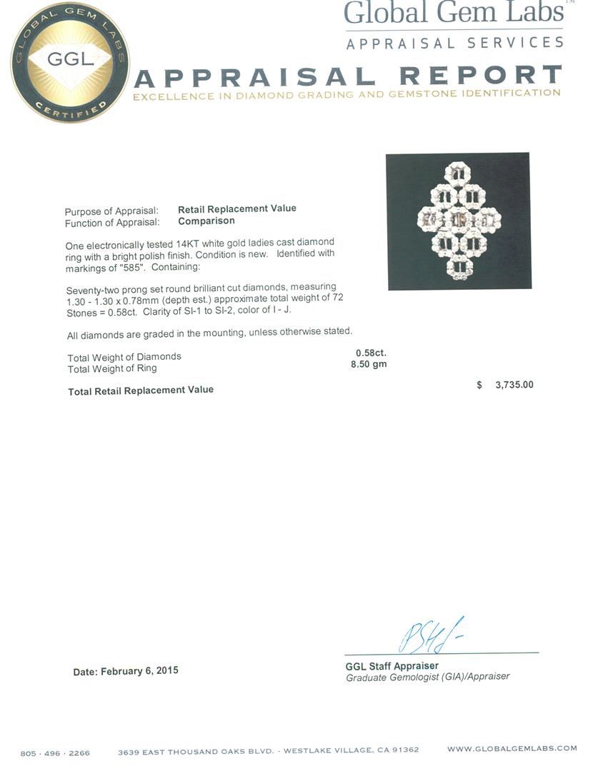 One electronically tested 14KT white gold ladies cast diamond ring with a bright polish finish. Identified with markings of "585". Condition is new. Containing: Seventy-Two prong set round brilliant cut diamonds, measuring 1.30 - 1.30 x 0.78mm (depth est.) approximate total weight of 72 Stones = 0.58ct. Clarity: SI-1 to SI-2. Color: I - J. All diamonds are graded in the mounting, unless otherwise stated. Total Weight of Diamonds 0.58ct. Total Weight of Ring 8.50 grams. GGL Appraised at $3,735.00.