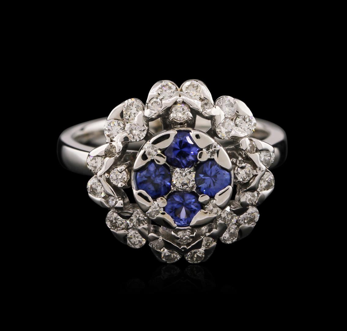 One electronically tested 14KT white gold ladies cast tanzanite and diamond ring with a bright polish finish. Identified with markings of "14K". Condition is new. Containing: Four prong set round modified brilliant cut natural tanzanites, measuring 3.00 - 3.00 x 1.95 mm, approximate total weight of 0.58ct., clarity is eye clean, type I, medium, moderately strong, blue color, (GIA B 5/4), cut is good. Thirty-Seven prong set round brilliant cut diamonds, measuring 1.80 - 1.30 x 0.93mm (depth est.) approximate total weight of 37 Stones = 0.67ct. Clarity: SI-1 to SI-2. Color: H - I, Cut is Good. Colored gemstones are presumed to have been subjected to commonly used enhancement processes. All diamonds and colored gemstones are graded in the mounting, unless otherwise stated. Total Weight of Colored Stones 0.58ct. Total Weight of Diamonds 0.67ct. Total Weight of Ring 5.70 grams.