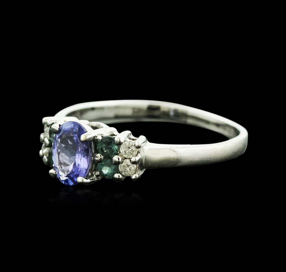 One electronically tested 14KT white gold ladies cast tanzanite, emerald and diamond ring with a bright polish finish. Identified with markings of "14K". Condition is new. Containing: One prong set oval modified brilliant cut natural tanzanite, measuring 6.40 x 4.50 x 2.93mm, approximate weight of 0.59ct., clarity is eye clean, type I, medium light, very slightly grayish, violet color, (GIA V 4/3), cut is good. Four prong set round modified brilliant cut natural emeralds, measuring 2.00 - 2.00 x 1.30 mm, approximate total weight of 0.12ct., clarity is slightly included, type III, medium, moderately strong, green color, (GIA G 5/4), cut is good. Four prong set round brilliant cut diamonds, measuring 1.70 - 1.70 x 1.02mm (depth est.) approximate total weight of 4 Stones = 0.07ct. Clarity: I-1 to I-2. Color: I - J, Cut is Good. Colored gemstones are presumed to have been subjected to commonly used enhancement processes. All diamonds and colored gemstones are graded in the mounting, unless otherwise stated. Total Weight of Colored Stones 0.71ct. Total Weight of Diamonds 0.07ct. Total Weight of Ring 2.10 grams. GGL Appraised at $1,160.00.
