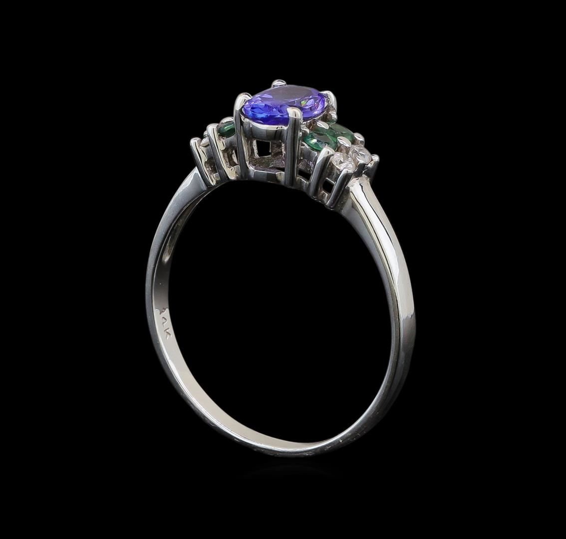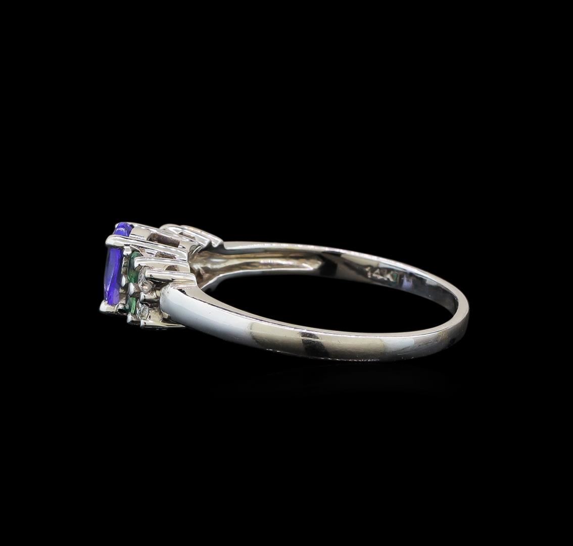 One electronically tested 14KT white gold ladies cast tanzanite, emerald and diamond ring with a bright polish finish. Identified with markings of "14K". Condition is new. Containing: One prong set oval modified brilliant cut natural tanzanite, measuring 6.40 x 4.50 x 2.93mm, approximate weight of 0.59ct., clarity is eye clean, type I, medium light, very slightly grayish, violet color, (GIA V 4/3), cut is good. Four prong set round modified brilliant cut natural emeralds, measuring 2.00 - 2.00 x 1.30 mm, approximate total weight of 0.12ct., clarity is slightly included, type III, medium, moderately strong, green color, (GIA G 5/4), cut is good. Four prong set round brilliant cut diamonds, measuring 1.70 - 1.70 x 1.02mm (depth est.) approximate total weight of 4 Stones = 0.07ct. Clarity: I-1 to I-2. Color: I - J, Cut is Good. Colored gemstones are presumed to have been subjected to commonly used enhancement processes. All diamonds and colored gemstones are graded in the mounting, unless otherwise stated. Total Weight of Colored Stones 0.71ct. Total Weight of Diamonds 0.07ct. Total Weight of Ring 2.10 grams. GGL Appraised at $1,160.00.