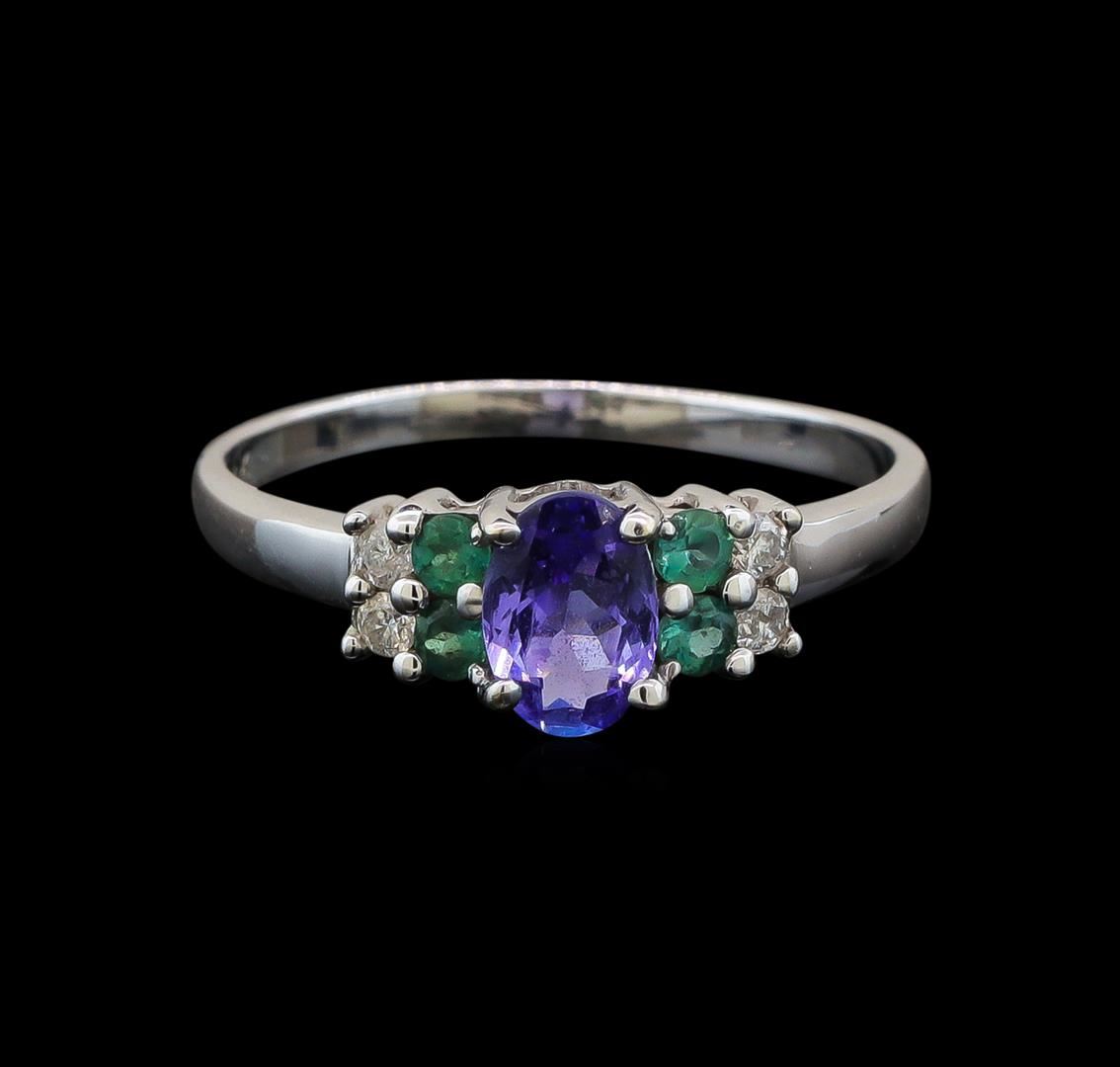 One electronically tested 14KT white gold ladies cast tanzanite, emerald and diamond ring with a bright polish finish. Identified with markings of "14K". Condition is new. Containing: One prong set oval modified brilliant cut natural tanzanite, measuring 6.40 x 4.50 x 2.93mm, approximate weight of 0.59ct., clarity is eye clean, type I, medium light, very slightly grayish, violet color, (GIA V 4/3), cut is good. Four prong set round modified brilliant cut natural emeralds, measuring 2.00 - 2.00 x 1.30 mm, approximate total weight of 0.12ct., clarity is slightly included, type III, medium, moderately strong, green color, (GIA G 5/4), cut is good. Four prong set round brilliant cut diamonds, measuring 1.70 - 1.70 x 1.02mm (depth est.) approximate total weight of 4 Stones = 0.07ct. Clarity: I-1 to I-2. Color: I - J, Cut is Good. Colored gemstones are presumed to have been subjected to commonly used enhancement processes. All diamonds and colored gemstones are graded in the mounting, unless otherwise stated. Total Weight of Colored Stones 0.71ct. Total Weight of Diamonds 0.07ct. Total Weight of Ring 2.10 grams. GGL Appraised at $1,160.00.