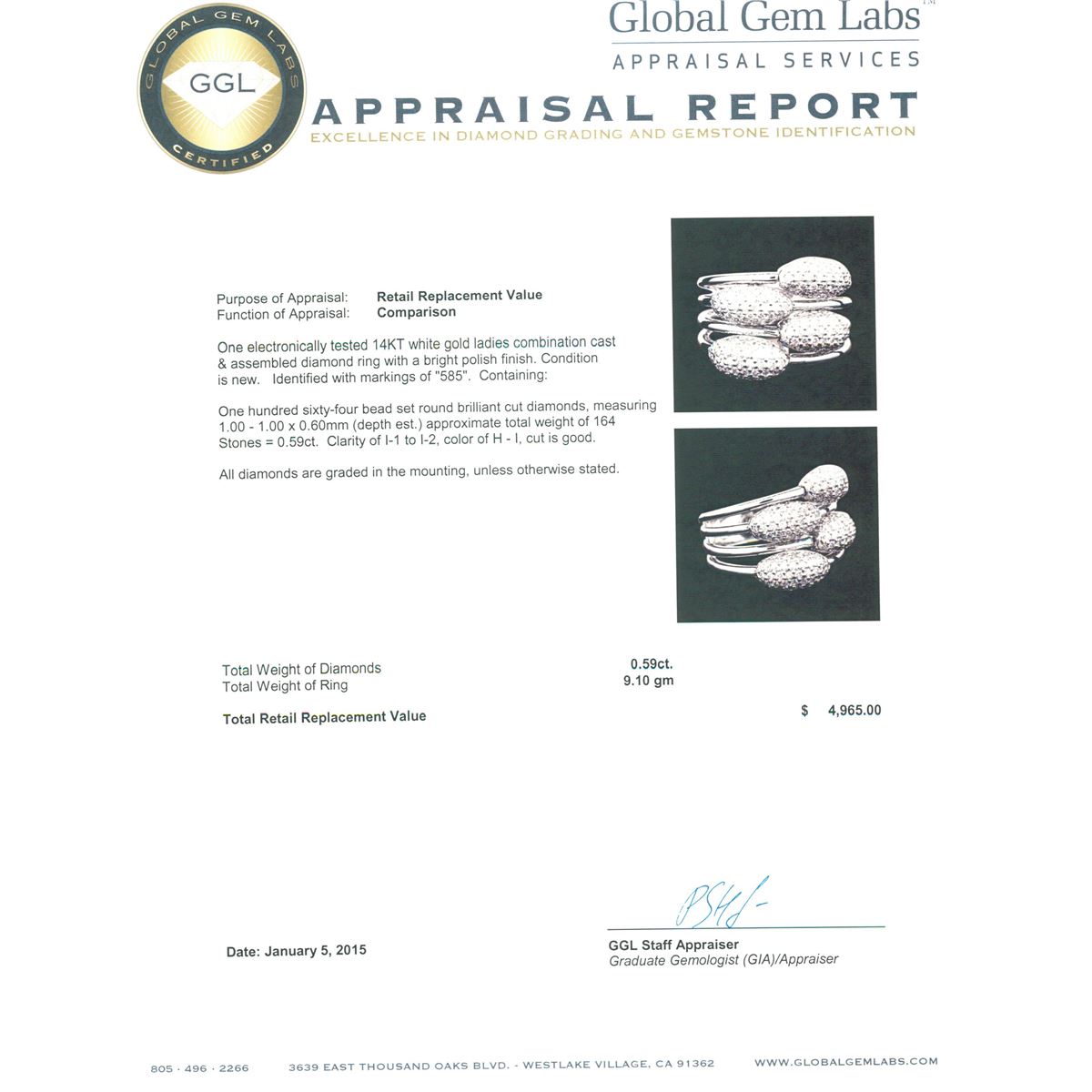 One electronically tested 14KT white gold ladies combination cast & assembled diamond ring with a bright polish finish. Identified with markings of "585". Condition is new. Containing: One Hundred Sixty-Four bead set round brilliant cut diamonds, measuring 1.00 - 1.00 x 0.60mm (depth est.) approximate total weight of 164 Stones = 0.59ct. Clarity: I-1 to I-2. Color: H - I, Cut is Good. All diamonds are graded in the mounting, unless otherwise stated. Total Weight of Diamonds 0.59ct. Total Weight of Ring 9.10 grams. GGL Appraised at $4,965.00.
