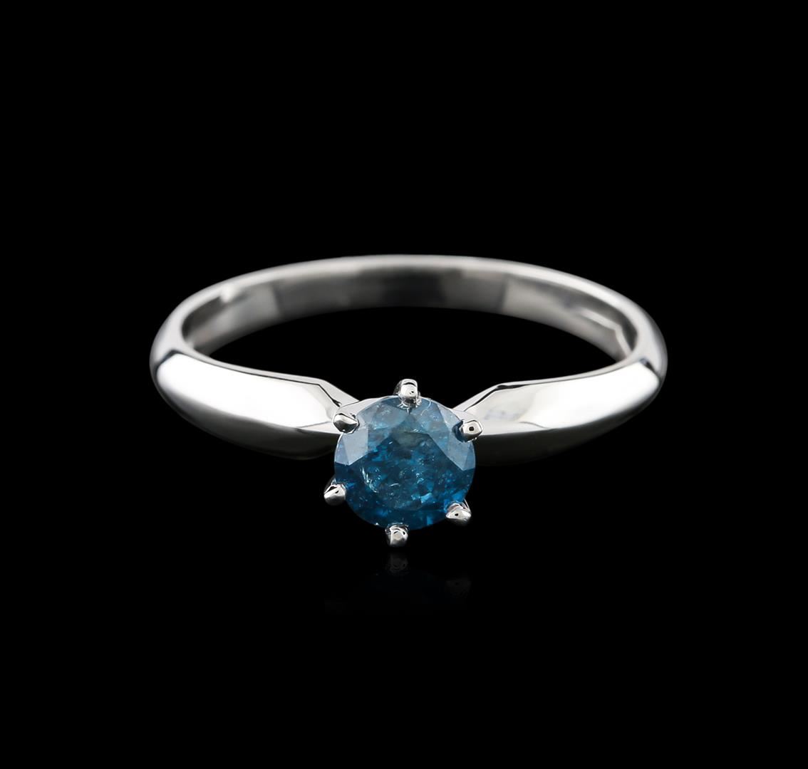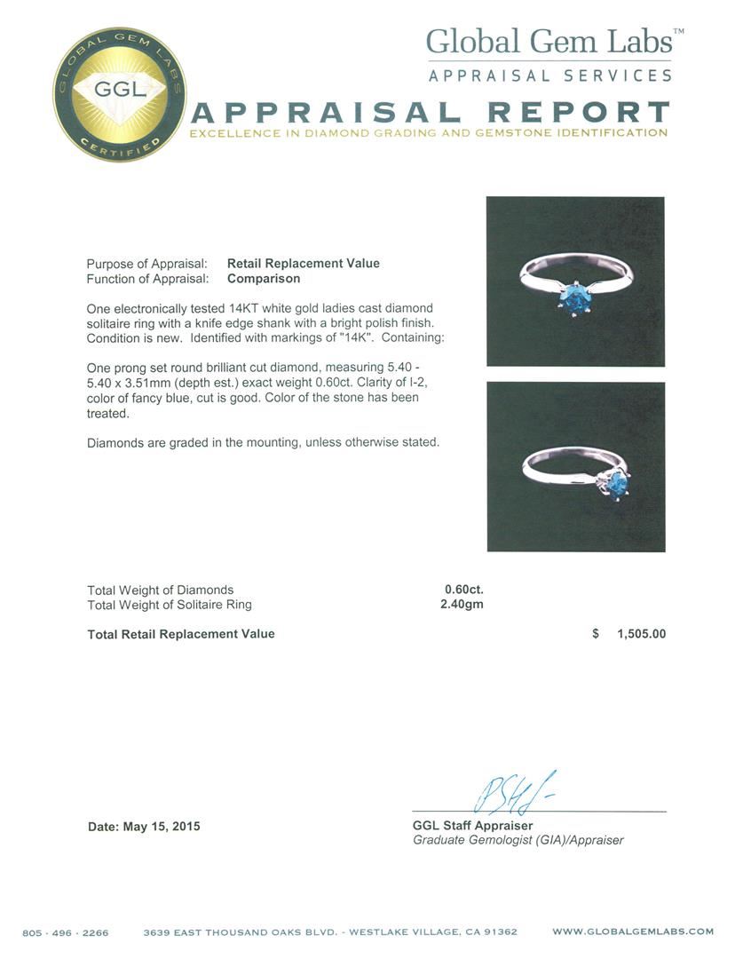 One electronically tested 14KT white gold ladies cast diamond solitaire ring with a knife edge shank with a bright polish finish. Identified with markings of "14K". Condition is new. Containing: One prong set round brilliant cut diamond, measuring 5.40 - 5.40 x 3.51mm (depth est.) exact weight 0.60ct. Clarity: I-2, Cut is Good. Color of the stone has been treated. Diamonds are graded in the mounting, unless otherwise stated. Total Weight of Diamonds 0.60ct. Total Weight of Solitaire Ring 2.40 grams. GGL Appraised at $1,505.00.