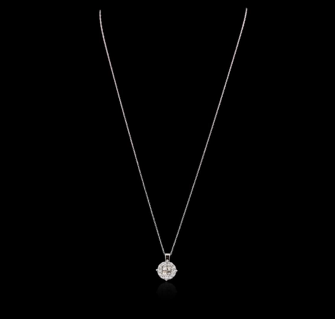 One pendant with chain featuring: 14KT white gold weighing 2.6 grams containing princess and round cut diamonds weighing a total of 0.60ct.