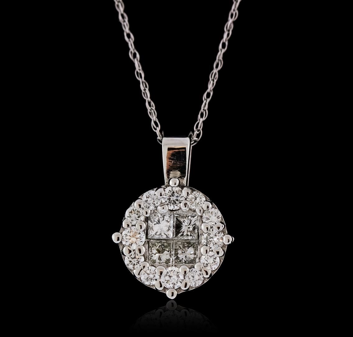 One pendant with chain featuring: 14KT white gold weighing 2.6 grams containing princess and round cut diamonds weighing a total of 0.60ct.