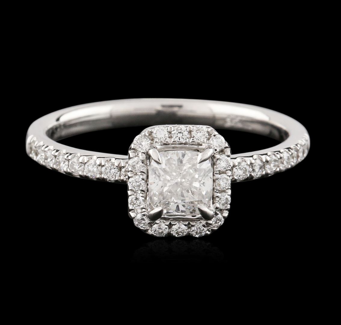 One ring featuring: 14KT white gold weighing 2.80 grams containing one prong set cushion cut center diamond with a total weight of 0.34ct and prong set round diamonds with a total weight of 0.27ct.