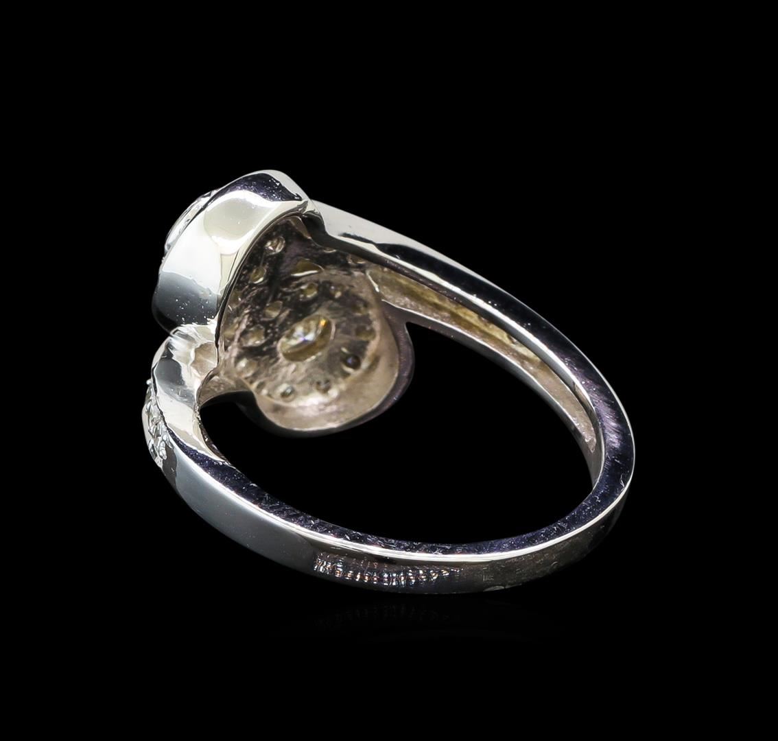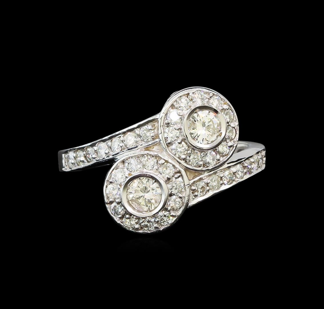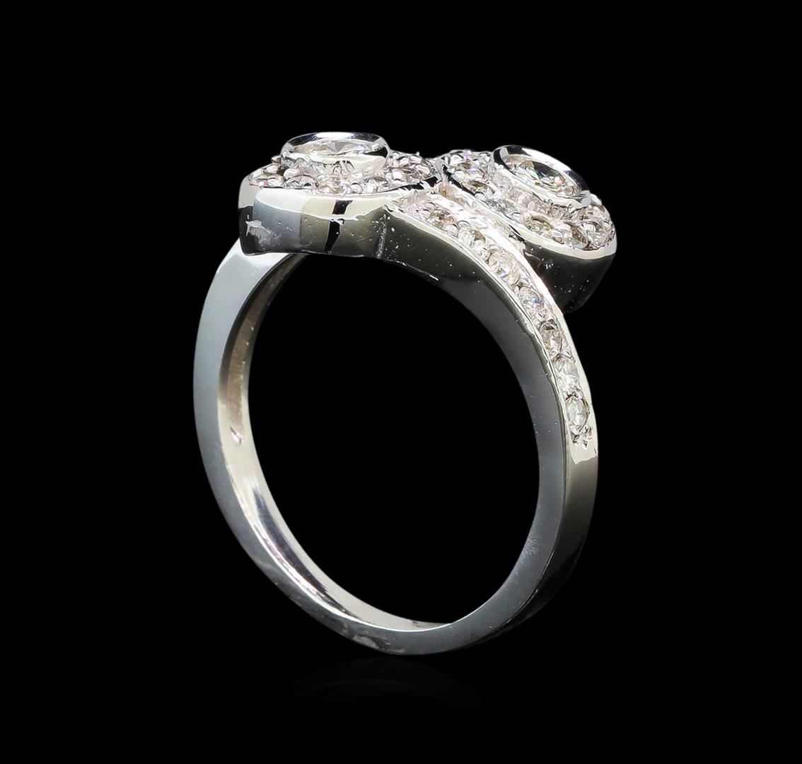 One electronically tested 14KT white gold ladies cast diamond ring with a bright polish finish. Identified with markings of "14K". Condition is new. Containing: Two bezel set round brilliant cut diamonds, measuring 3.50 - 3.50 x 2.10mm (depth est.) approximate total weight of 2 Stones = 0.31ct. Clarity: I-1. Color: J, Cut is Good. Thirty-Eight prong set round brilliant cut diamonds, measuring 1.30 - 1.30 x 0.78mm (depth est.) approximate total weight of 38 Stones = 0.30ct. Clarity: SI-2 to I-1. Color: I - J. All diamonds are graded in the mounting, unless otherwise stated. Total Weight of Diamonds 0.62ct. Total Weight of Ring 4.40 grams. GGL Appraised at $2,920.00.