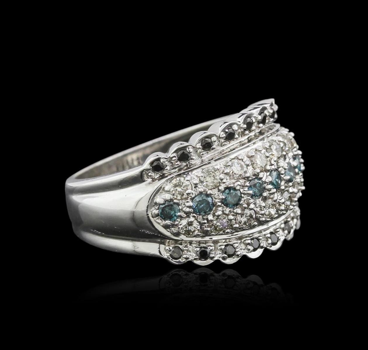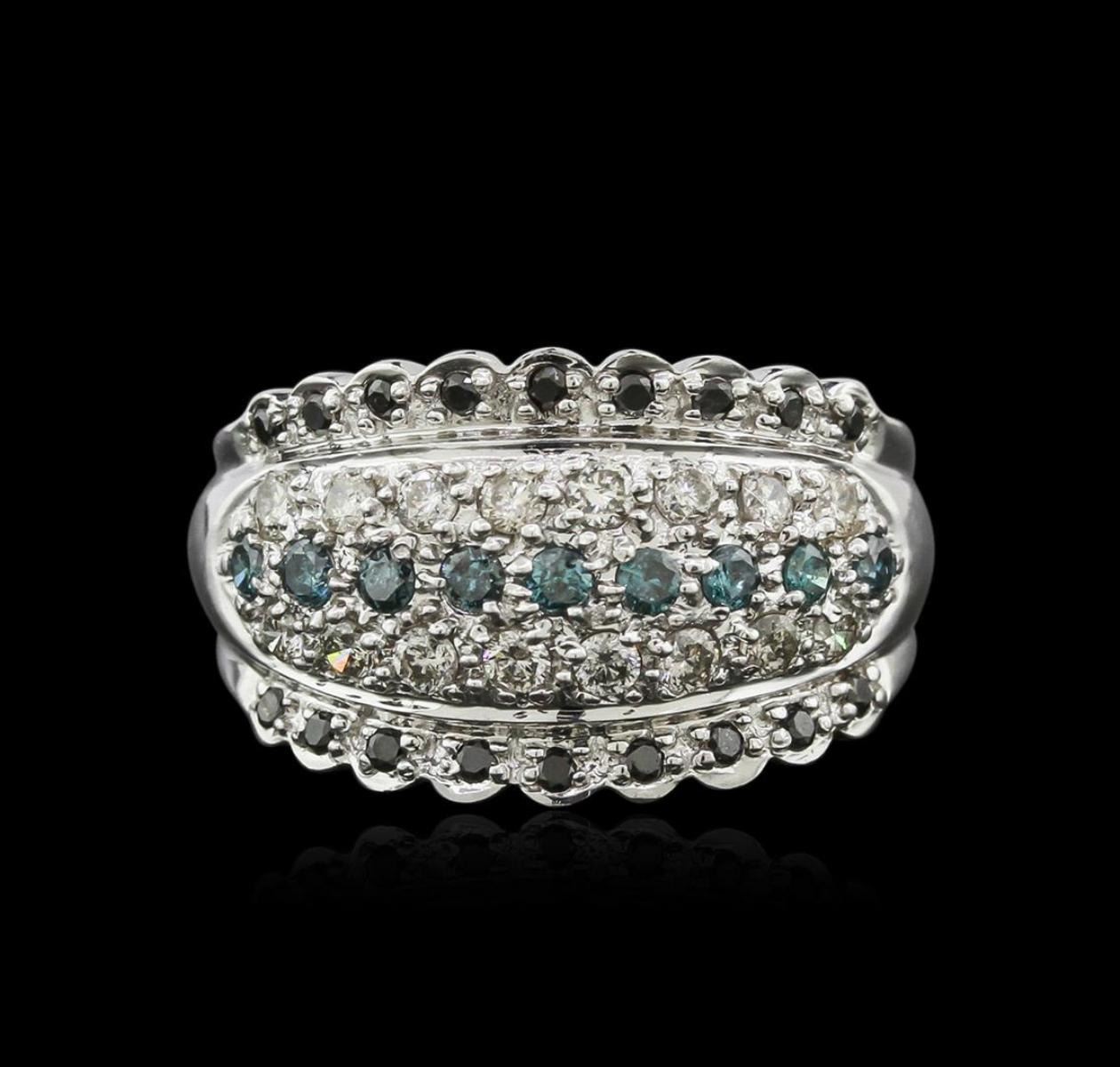 One electronically tested 14KT white gold ladies cast diamond ring with a bright polish finish. Identified with markings of "14K". Condition is very good. Containing: Eighteen prong set round brilliant cut diamonds, measuring 1.20 - 1.20 x 0.72mm (depth est.) approximate total weight of 18 Stones = 0.11ct. color of Fancy Black, Cut is Good. Nine prong set round brilliant cut diamonds, measuring 1.80 - 1.60 x 1.02mm (depth est.) approximate total weight of 9 Stones = 0.16ct. Clarity: I-1 to I-2, color of Fancy Blue, Cut is Good. Color of the stone has been treated. Sixteen prong set round brilliant cut diamonds, measuring 1.80 - 1.80 x 1.08mm (depth est.) approximate total weight of 16 Stones = 0.34ct. Clarity: I-1 to I-2. Color: J - K, Cut is Good. All diamonds are graded in the mounting, unless otherwise stated. Total Weight of Diamonds 0.62ct. Total Weight of Ring 6.40 grams. GGL Appraised.