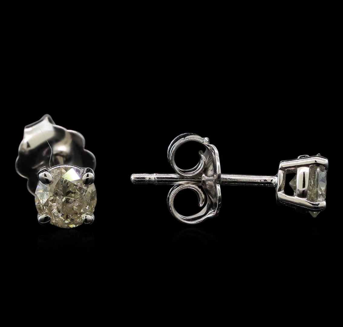 One pair electronically tested 14KT white gold ladies cast diamond stud earrings with friction posts with a bright polish finish. Identified with markings of "14K". Condition is new. Containing: Two prong set round brilliant cut diamonds, measuring 4.38 - 4.38 x 2.64mm (depth est.) approximate total weight of 2 Stones = 0.62ct. Clarity: I-3 to I-3. Color: K, Cut is Good. Diamonds are graded in the mounting, unless otherwise stated. Total Weight of Diamonds 0.62ct. Total Weight of Stud Earrings 0.70 grams. GGL Appraised.