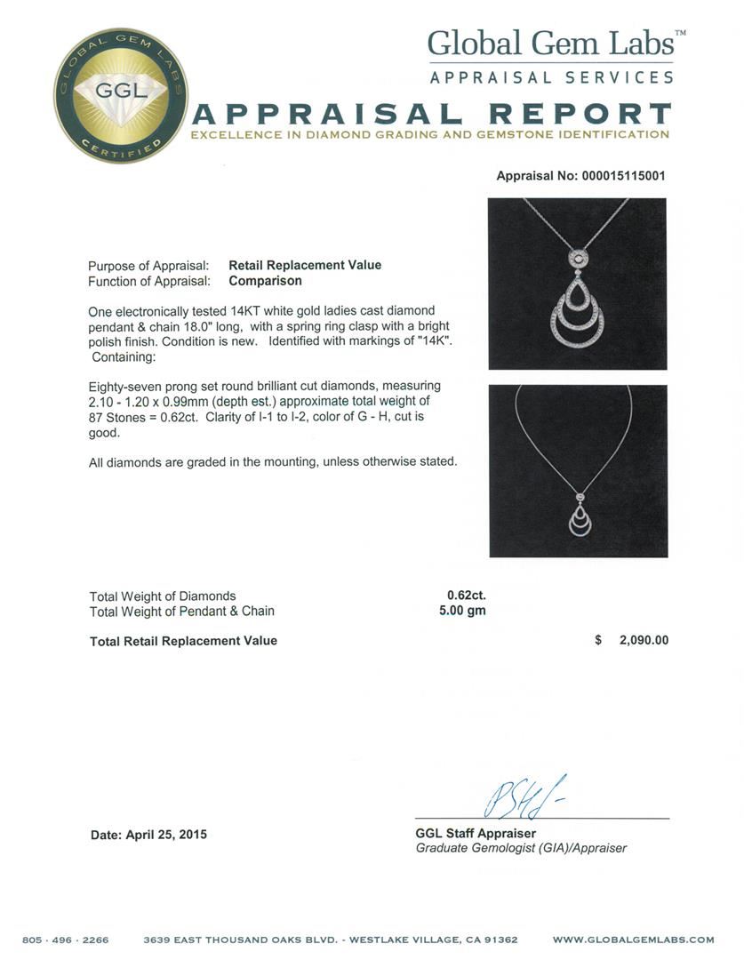 One electronically tested 14KT white gold ladies cast diamond pendant & chain 18.0" long, with a spring ring clasp with a bright polish finish. Identified with markings of "14K". Condition is new. Containing: Eighty-Seven prong set round brilliant cut diamonds, measuring 2.10 - 1.20 x 0.99mm (depth est.) approximate total weight of 87 Stones = 0.62ct. Clarity: I-1 to I-2. Color: G - H, Cut is Good. All diamonds are graded in the mounting, unless otherwise stated. Total Weight of Diamonds 0.62ct. Total Weight of Pendant & Chain 5.00 grams. GGL Appraised at $2,090.00.