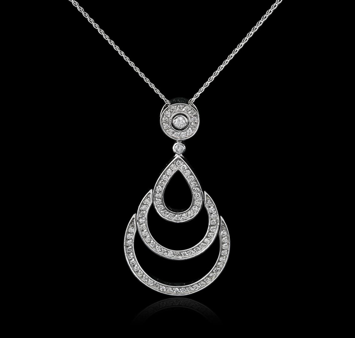 One electronically tested 14KT white gold ladies cast diamond pendant & chain 18.0" long, with a spring ring clasp with a bright polish finish. Identified with markings of "14K". Condition is new. Containing: Eighty-Seven prong set round brilliant cut diamonds, measuring 2.10 - 1.20 x 0.99mm (depth est.) approximate total weight of 87 Stones = 0.62ct. Clarity: I-1 to I-2. Color: G - H, Cut is Good. All diamonds are graded in the mounting, unless otherwise stated. Total Weight of Diamonds 0.62ct. Total Weight of Pendant & Chain 5.00 grams. GGL Appraised at $2,090.00.