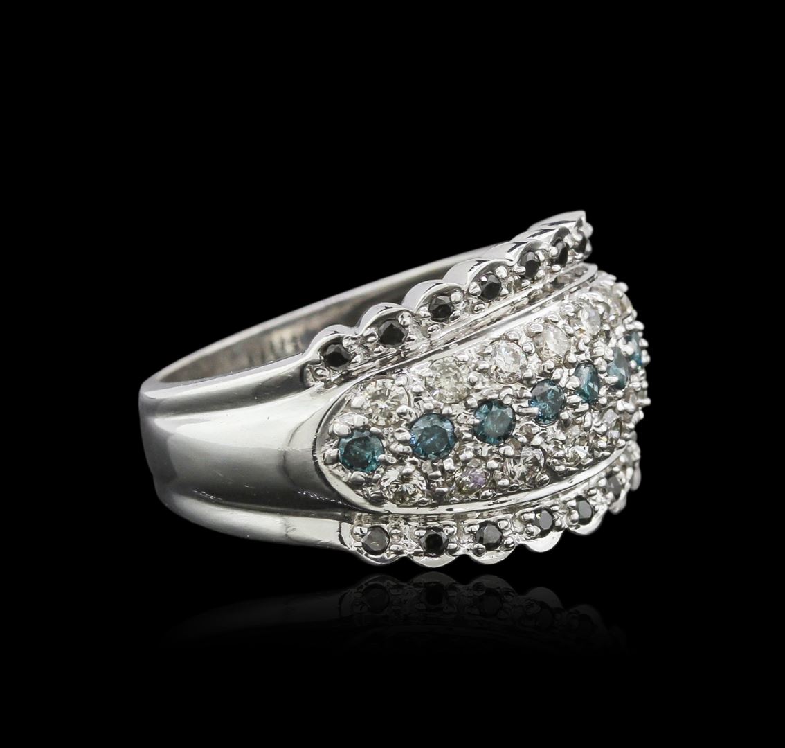 One electronically tested 14KT white gold ladies cast diamond ring with a bright polish finish. Identified with markings of "14K". Condition is very good. Containing: Eighteen prong set round brilliant cut diamonds, measuring 1.20 - 1.20 x 0.72mm (depth est.) approximate total weight of 18 Stones = 0.11ct. color of Fancy Black, Cut is Good. Nine prong set round brilliant cut diamonds, measuring 1.80 - 1.60 x 1.02mm (depth est.) approximate total weight of 9 Stones = 0.16ct. Clarity: I-1 to I-2, color of Fancy Blue, Cut is Good. Color of the stone has been treated. Sixteen prong set round brilliant cut diamonds, measuring 1.80 - 1.80 x 1.08mm (depth est.) approximate total weight of 16 Stones = 0.34ct. Clarity: I-1 to I-2. Color: J - K, Cut is Good. All diamonds are graded in the mounting, unless otherwise stated. Total Weight of Diamonds 0.62ct. Total Weight of Ring 6.40 grams. GGL Appraised at $2,325.00.