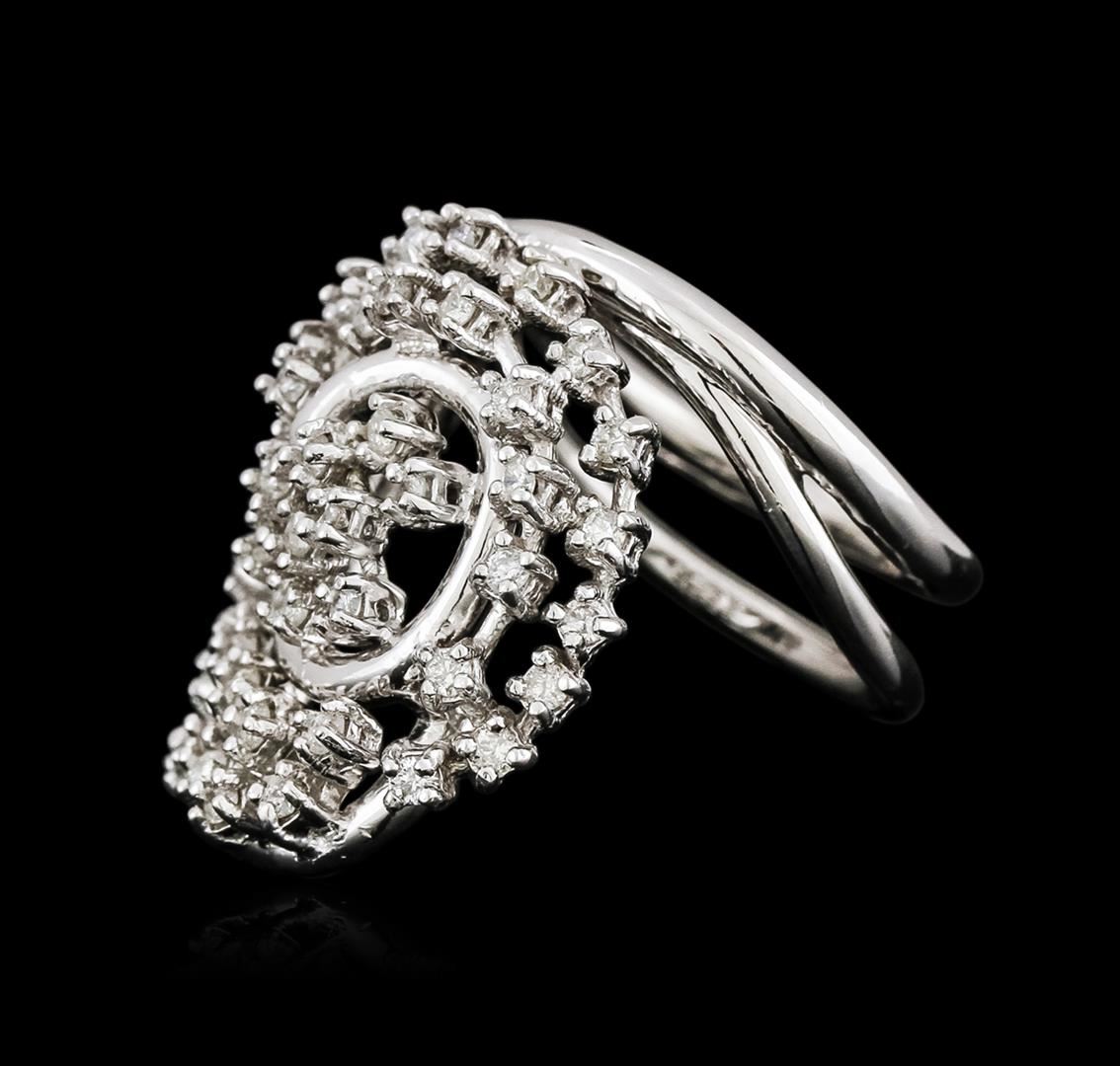 One electronically tested 14KT white gold ladies cast diamond ring with a bright polish finish. Identified with markings of "K14". Condition is new. Containing: Fifty prong set round brilliant cut diamonds, measuring 1.50 - 1.50 x 0.90mm (depth est.) approximate total weight of 50 Stones = 0.62ct. Clarity: SI-2 to I-1. Color: J - K, Cut is Good. All diamonds are graded in the mounting, unless otherwise stated. Total Weight of Diamonds 0.62ct. Total Weight of Ring 12.30 grams. GGL Appraised at $4,520.00.