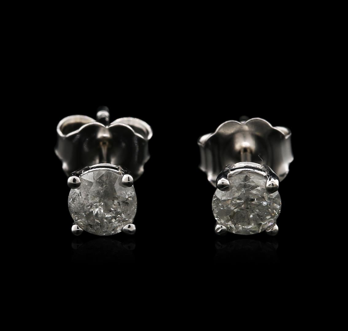 One pair electronically tested 14KT white gold ladies cast diamond stud earrings with friction posts with a bright polish finish. Identified with markings of "14K". Condition is new. Containing: Two prong set round brilliant cut diamonds, measuring 4.40 - 4.40 x 2.64mm (depth est.) approximate total weight of 2 Stones = 0.62ct. Clarity: I-3. Color: J, Cut is Good. Diamonds are graded in the mounting, unless otherwise stated. Total Weight of Diamonds 0.62ct. Total Weight of Stud Earrings 0.90 grams. GGL Appraised at $815.00.