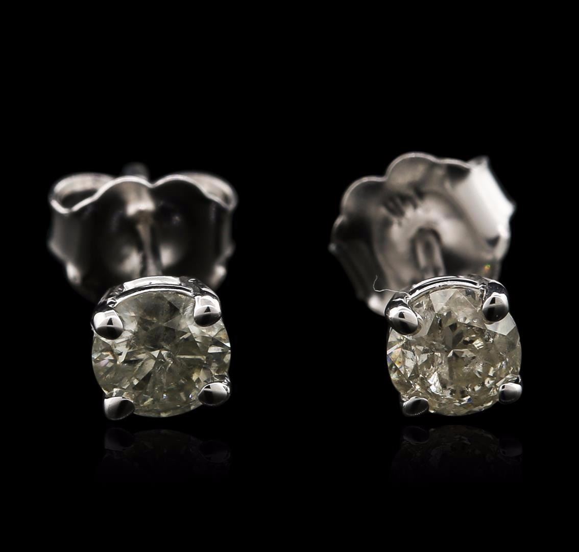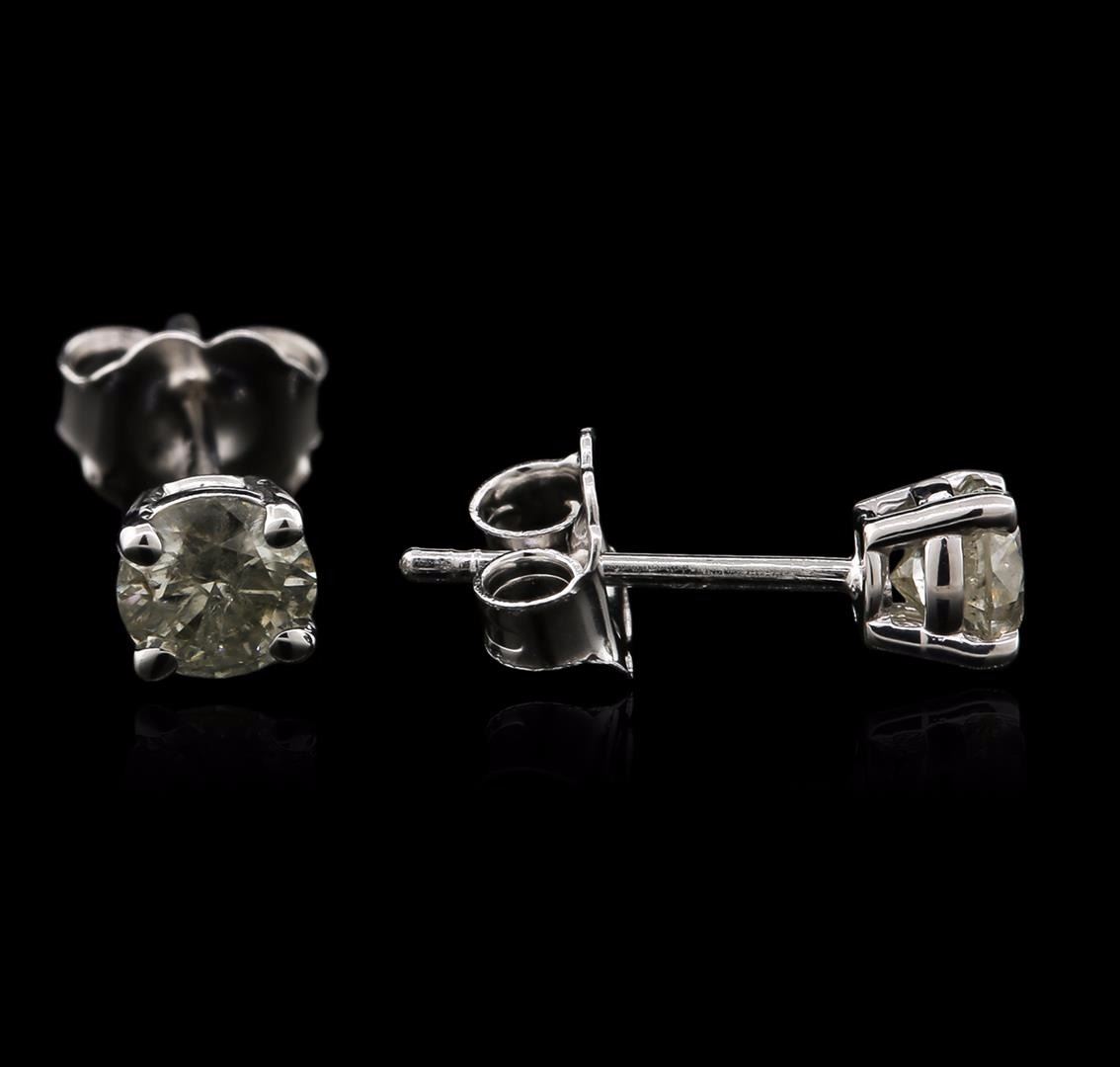 One pair electronically tested 14KT white gold ladies cast diamond stud earrings with friction posts with a bright polish finish. Identified with markings of "14K". Condition is new. Containing: Two prong set round brilliant cut diamonds, measuring 4.38 - 4.38 x 2.64mm (depth est.) approximate total weight of 2 Stones = 0.62ct. Clarity: I-3 to I-3. Color: K, Cut is Good. Diamonds are graded in the mounting, unless otherwise stated. Total Weight of Diamonds 0.62ct. Total Weight of Stud Earrings 0.70 grams. GGL Appraised at $740.00.