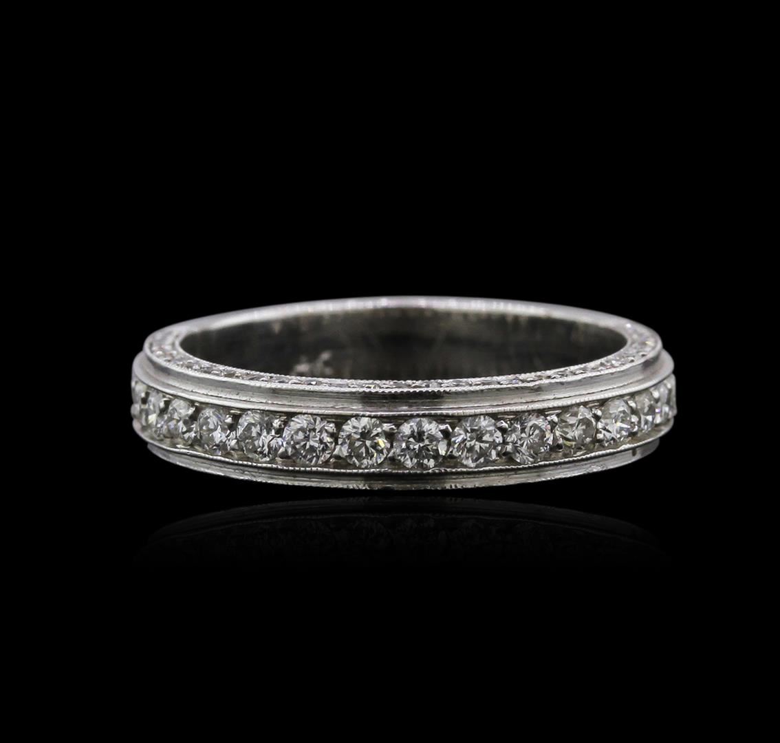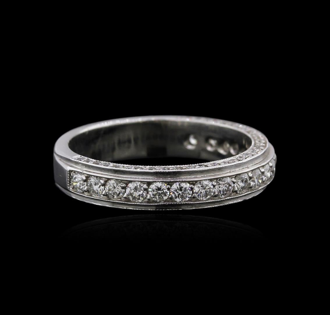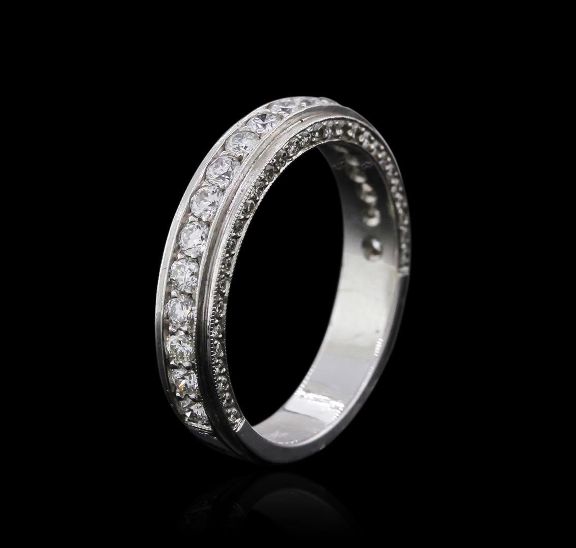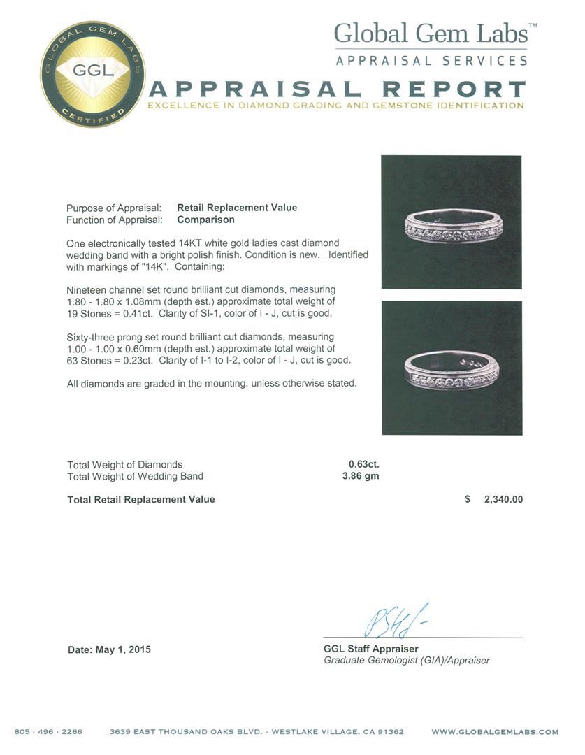 One electronically tested 14KT white gold ladies cast diamond wedding band with a bright polish finish. Identified with markings of "14K". Condition is new. Containing: Nineteen channel set round brilliant cut diamonds, measuring 1.80 - 1.80 x 1.08mm (depth est.) approximate. Total Weight of 19 Stones = 0.41ct. Clarity: SI-1. Color: I - J, Cut is Good. Sixty-Three prong set round brilliant cut diamonds, measuring 1.00 - 1.00 x 0.60mm (depth est.) approximate. Total Weight of 63 Stones = 0.23ct. Clarity: I-1 to I-2. Color: I - J, Cut is Good. All diamonds are graded in the mounting, unless otherwise stated. Total Weight of Diamonds 0.63ct. Total Weight of Wedding Band 3.86 grams. GGL Appraised at $2,340.00.