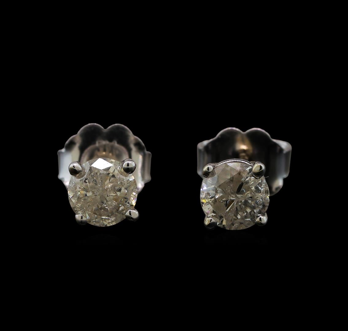 One pair electronically tested 14KT white gold ladies cast diamond stud earrings with friction posts with a bright polish finish. Identified with markings of "14K". Condition is new. Containing: Two prong set round brilliant cut diamonds, measuring 4.40 - 4.40 x 2.66mm (depth est.) approximate total weight of 2 Stones = 0.63ct. Clarity: I-3 to I-3. Color: K, Cut is Good. Diamonds are graded in the mounting, unless otherwise stated. Total Weight of Diamonds 0.63ct. Total Weight of Stud Earrings 0.80 grams. GGL Appraised at $870.00.