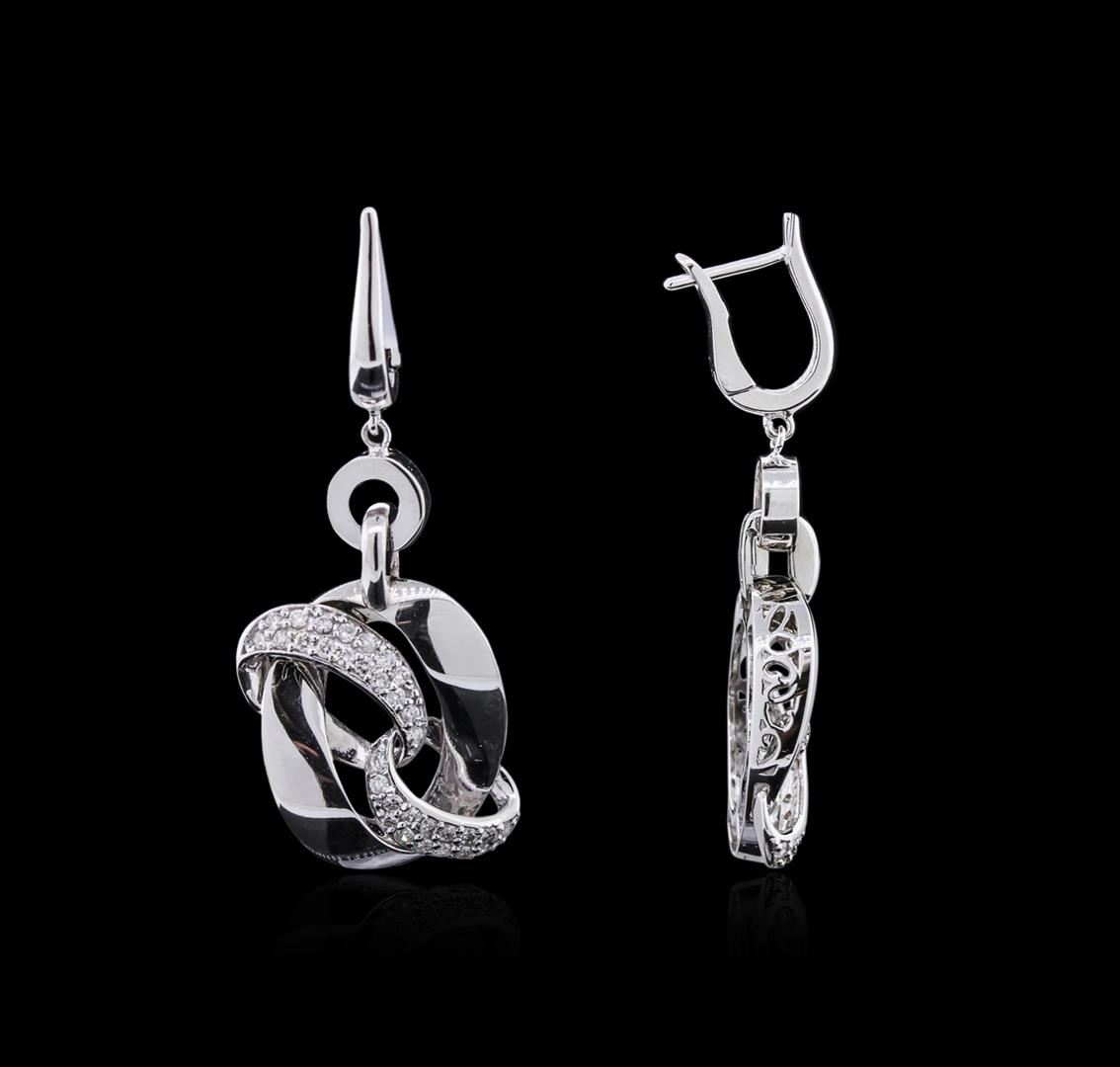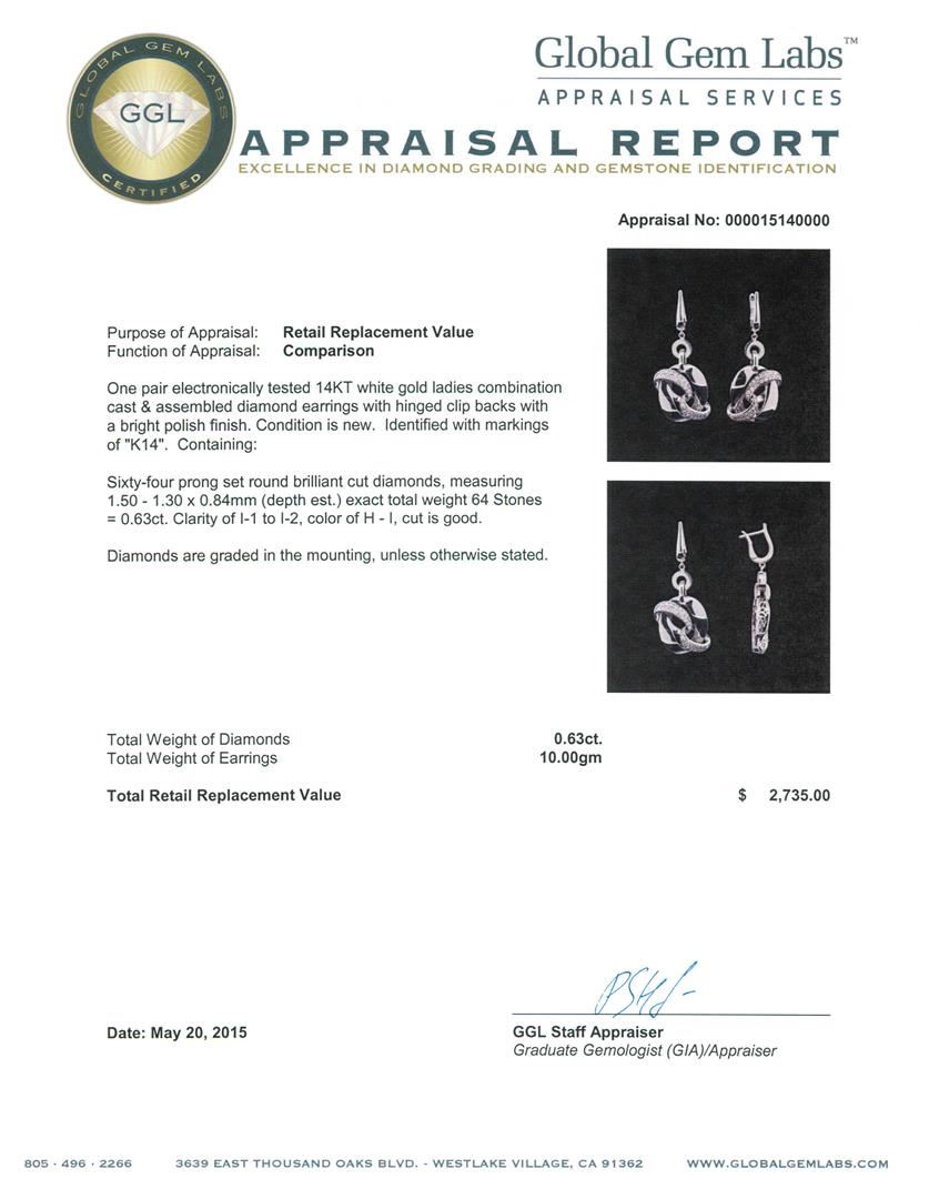One pair electronically tested 14KT white gold ladies combination cast & assembled diamond earrings with hinged clip backs with a bright polish finish. Identified with markings of "K14". Condition is new. Containing: Sixty-Four prong set round brilliant cut diamonds, measuring 1.50 - 1.30 x 0.84mm (depth est.) exact total weight 64 Stones = 0.63ct. Clarity: I-1 to I-2. Color: H - I, Cut is Good. Diamonds are graded in the mounting, unless otherwise stated. Total Weight of Diamonds 0.63ct. Total Weight of Earrings 10.00 grams. GGL Appraised at $2,735.00.