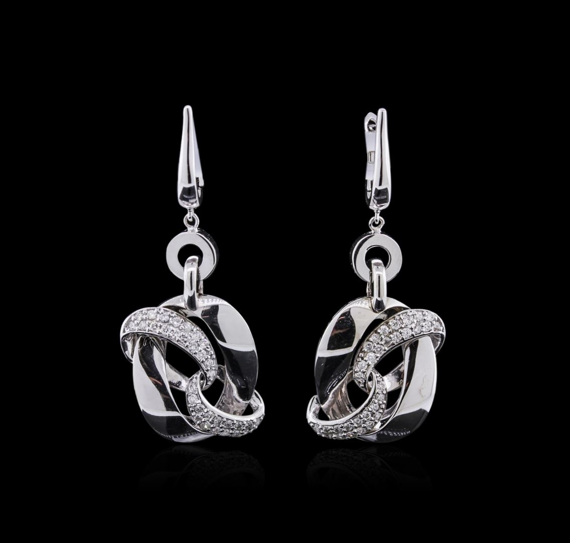 One pair electronically tested 14KT white gold ladies combination cast & assembled diamond earrings with hinged clip backs with a bright polish finish. Identified with markings of "K14". Condition is new. Containing: Sixty-Four prong set round brilliant cut diamonds, measuring 1.50 - 1.30 x 0.84mm (depth est.) exact total weight 64 Stones = 0.63ct. Clarity: I-1 to I-2. Color: H - I, Cut is Good. Diamonds are graded in the mounting, unless otherwise stated. Total Weight of Diamonds 0.63ct. Total Weight of Earrings 10.00 grams. GGL Appraised at $2,735.00.
