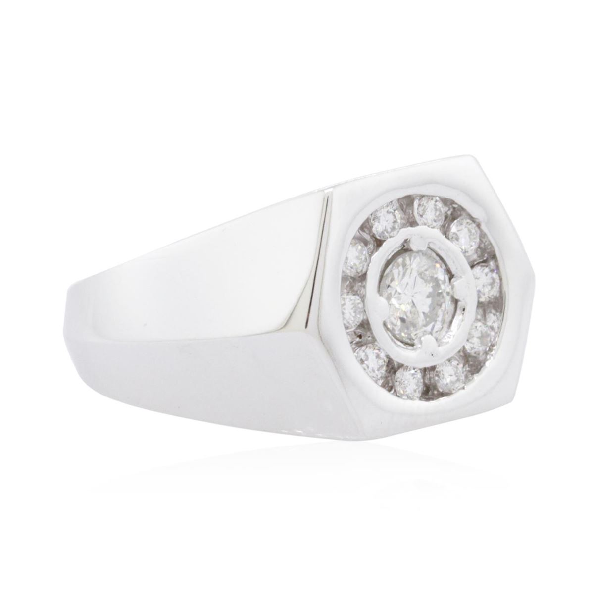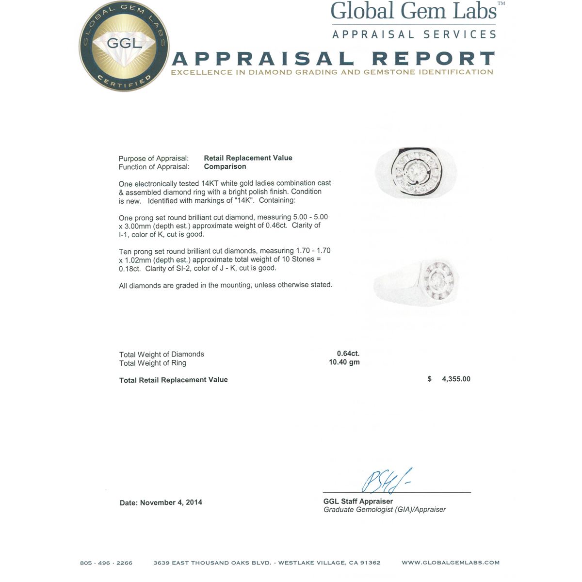 One electronically tested 14KT white gold ladies combination cast & assembled diamond ring with a bright polish finish. Identified with markings of "14K". Condition is new. Containing: One prong set round brilliant cut diamond, measuring 5.00 - 5.00 x 3.00mm (depth est.) approximate weight of 0.46ct. Clarity: I-1. Color: K, Cut is Good. Ten prong set round brilliant cut diamonds, measuring 1.70 - 1.70 x 1.02mm (depth est.) approximate total weight of 10 Stones = 0.18ct. Clarity: SI-2. Color: J - K, Cut is Good. All diamonds are graded in the mounting, unless otherwise stated. Total Weight of Diamonds 0.64ct. Total Weight of Ring 10.40 grams. GGL Appraised at $4,355.00.