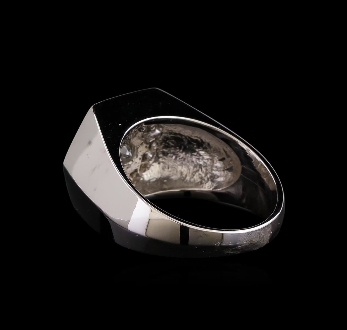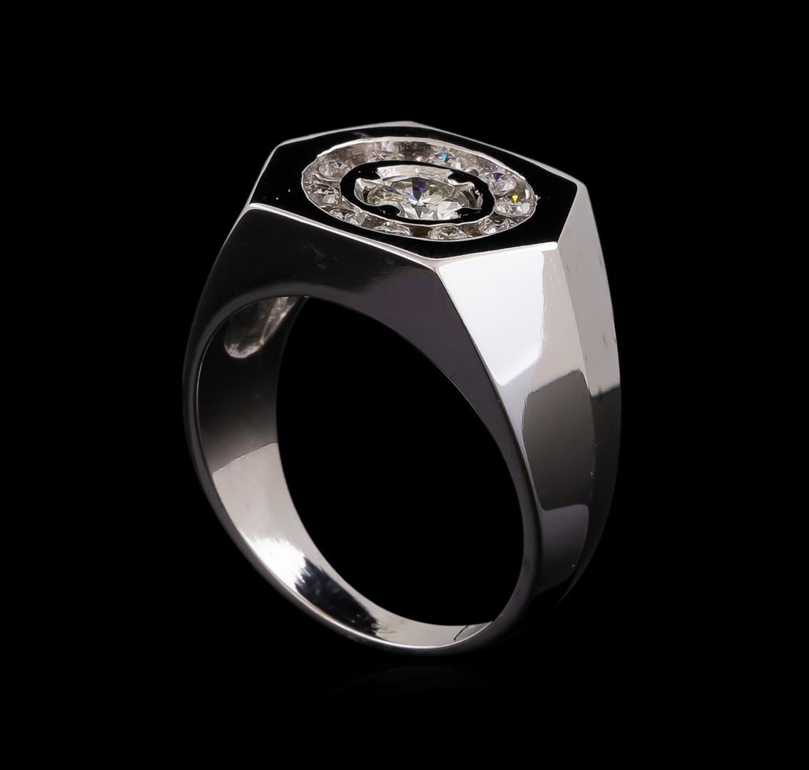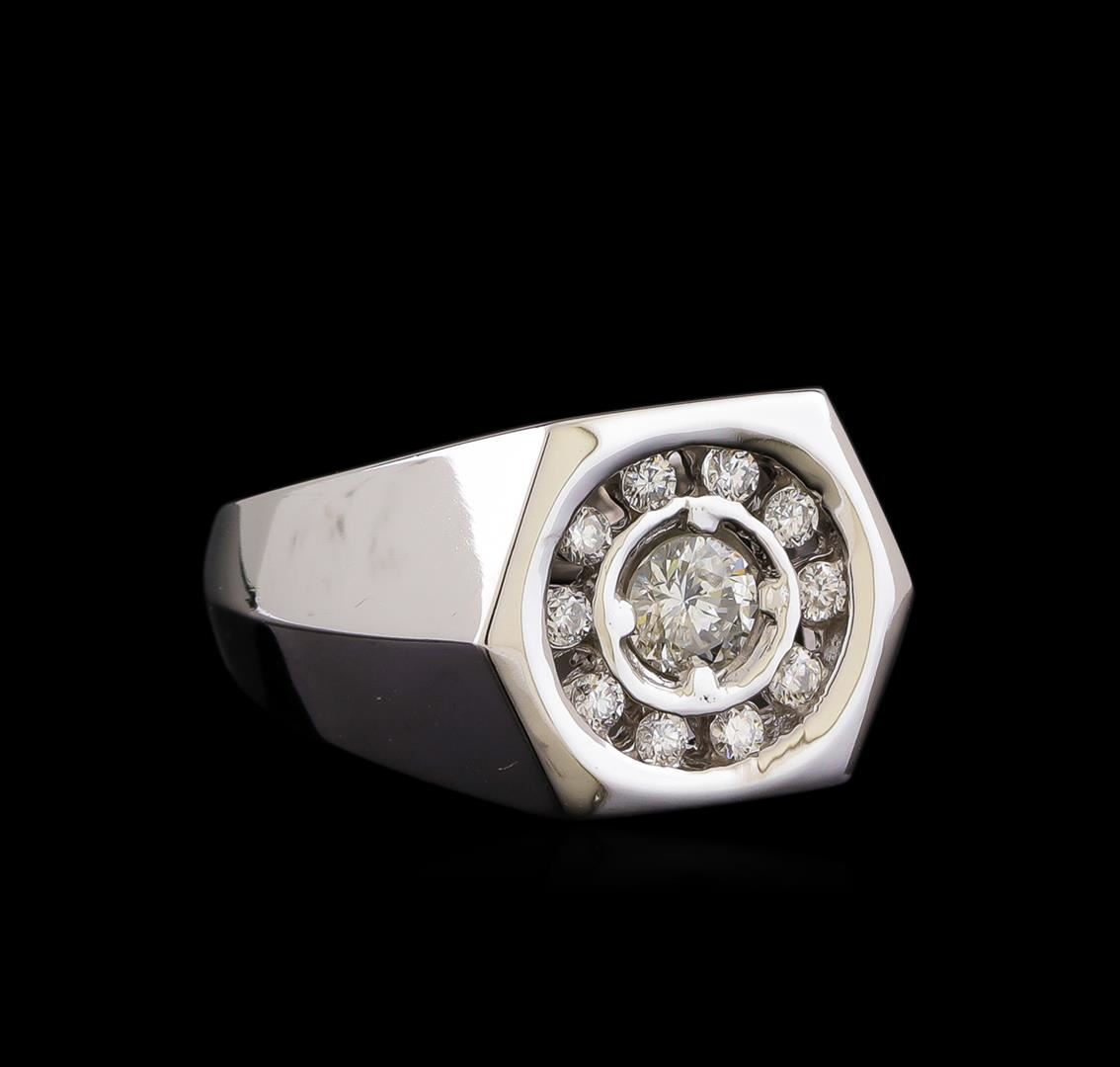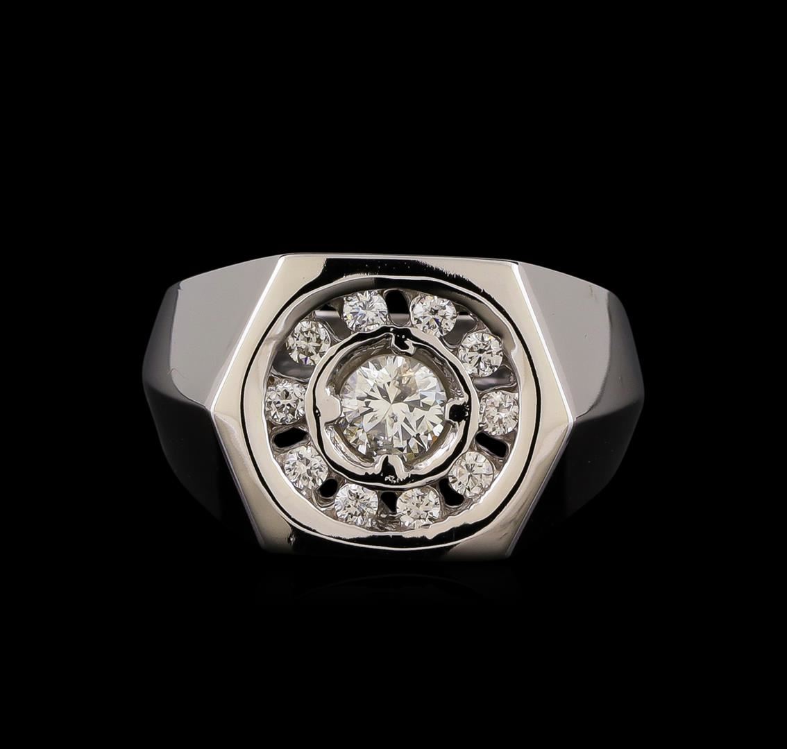 One electronically tested 14KT white gold ladies combination cast & assembled diamond ring with a bright polish finish. Identified with markings of "14K". Condition is new. Containing: One prong set round brilliant cut diamond, measuring 5.00 - 5.00 x 3.00mm (depth est.) approximate weight of 0.46ct. Clarity: I-1. Color: K, Cut is Good. Ten prong set round brilliant cut diamonds, measuring 1.70 - 1.70 x 1.02mm (depth est.) approximate total weight of 10 Stones = 0.18ct. Clarity: SI-2. Color: J - K, Cut is Good. All diamonds are graded in the mounting, unless otherwise stated. Total Weight of Diamonds 0.64ct. Total Weight of Ring 10.40 grams. GGL Appraised at $4,355.00.