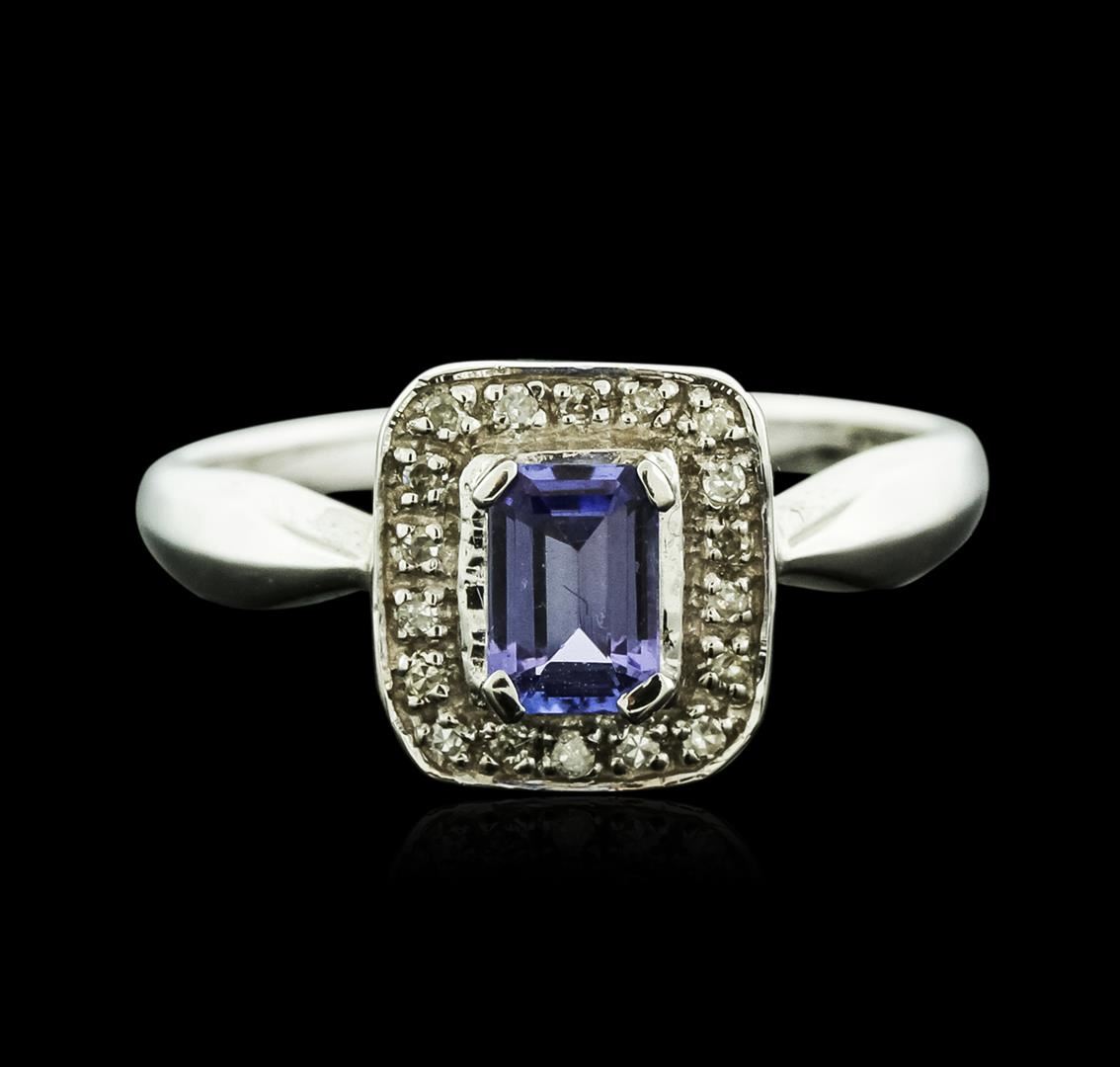 One electronically tested 14KT white gold ladies cast tanzanite and diamond ring with a bright polish finish. Identified with markings of "14K". Condition is new. Containing: One prong set emerald standard step cut natural tanzanite, measuring 5.90 x 4.30 x 2.80mm, approximate weight of 0.64ct., clarity is eye clean, type I, medium light, slightly grayish, violet color, (GIA V 4/2), cut is good. Eighteen prong set single cut diamonds, measuring 1.30 - 1.30 x 0.78mm (depth est.) approximate total weight of 18 Stones = 0.14ct. Clarity: I-1 to I-2. Color: I - J. Colored gemstones are presumed to have been subjected to commonly used enhancement processes. All diamonds and colored gemstones are graded in the mounting, unless otherwise stated. Total Weight of Colored Stones 0.64ct. Total Weight of Diamonds 0.14ct. Total Weight of Ring 2.90 grams. GGL Appraised at $1,355.00.