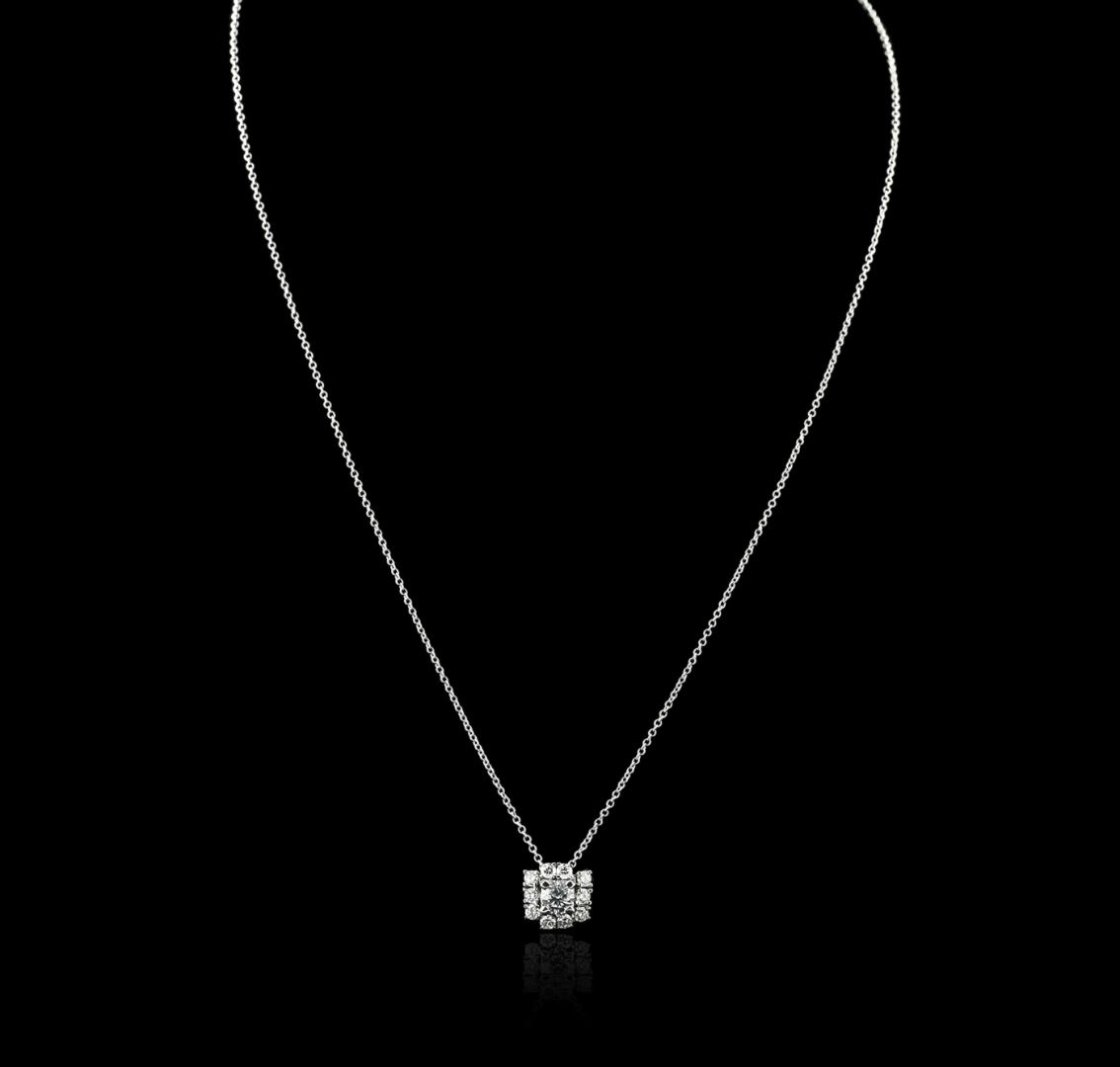 One pendant with chain featuring: 14KT white gold weighing 1.87 grams containing one diamond center stone with a total weight of 0.32ct and ten side diamonds with a total weight of 0.32ct.