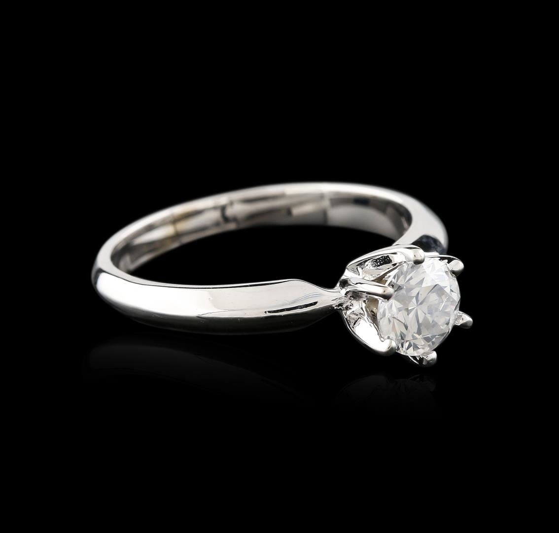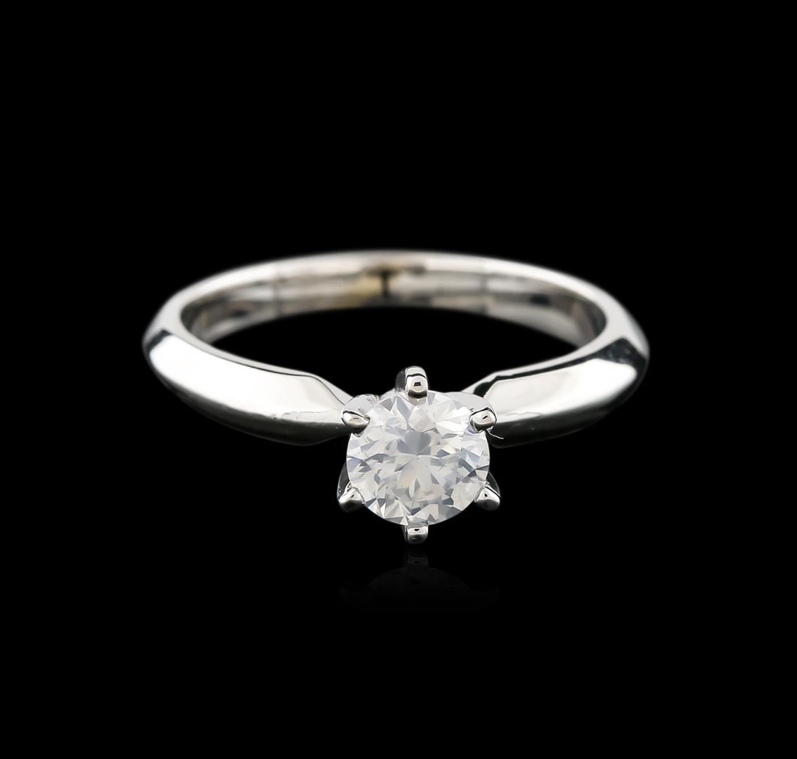 One electronically tested 14KT white gold ladies cast diamond solitaire ring with a knife edge shank with a bright polish finish. Identified with markings of "14K". Condition is new. Containing: One prong set round brilliant cut diamond, measuring 5.45 - 5.45 x 3.27mm (depth est.) exact weight 0.65ct. Clarity: I-1. Color: I, Cut is Good. Diamonds are graded in the mounting, unless otherwise stated. Total Weight of Diamonds 0.65ct. Total Weight of Solitaire Ring 2.90 grams. GGL Appraised at $2,260.00.