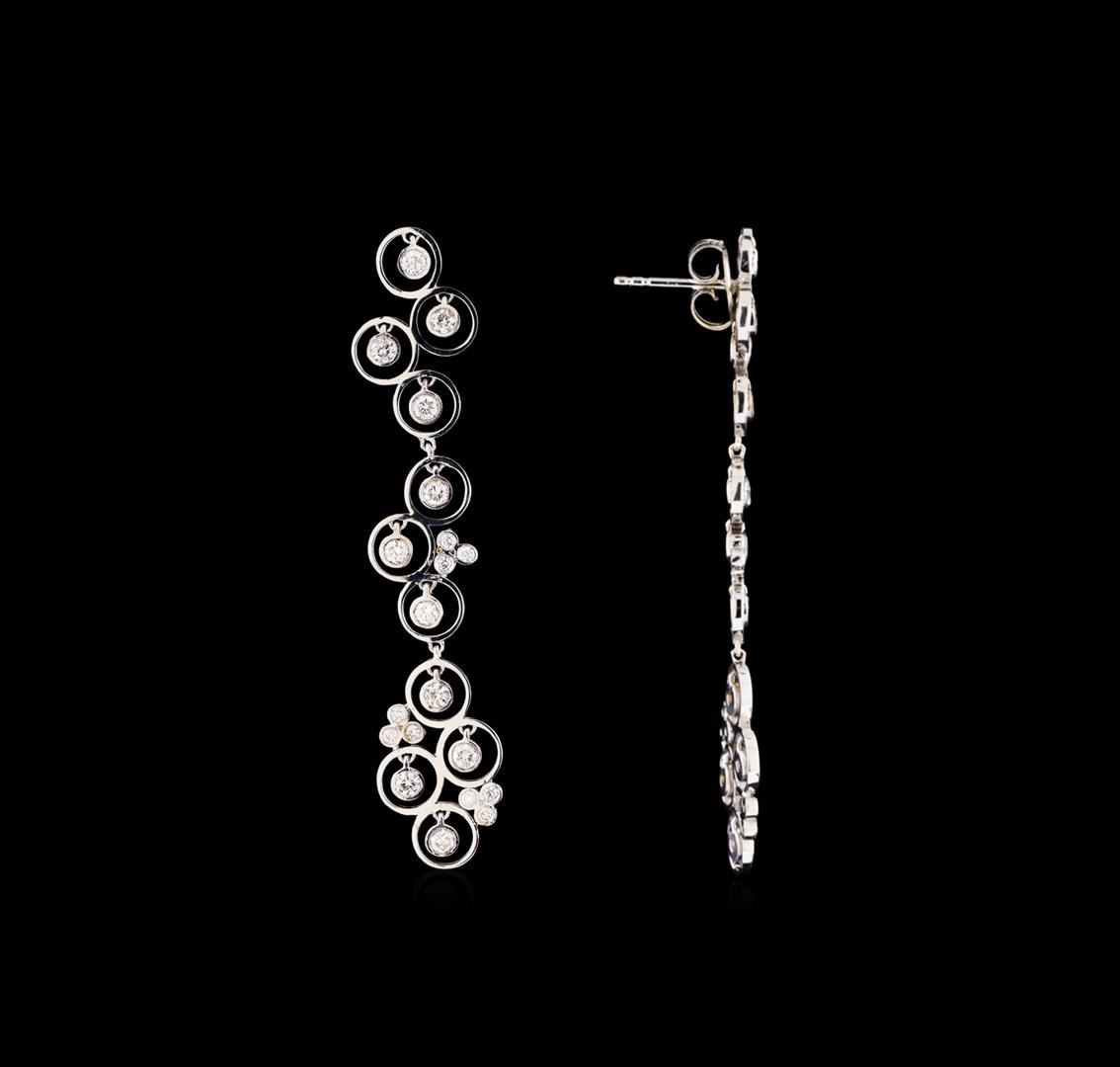 One pair electronically tested 14KT white gold ladies combination cast & assembled diamond dangle earrings with friction posts with a bright polish finish. Identified with markings of "14K". Condition is new. Containing: Forty prong set round brilliant cut diamonds, measuring 2.10 - 1.20 x 0.99mm (depth est.) approximate total weight of 40 Stones = 0.66ct. . Clarity: SI-2 to I-1. Color: I - J, Cut is Good. All diamonds are graded in the mounting, unless otherwise stated. Total Weight of Diamonds 0.66ct. Total Weight of Dangle Earrings 7.30 grams. GGL Appraised at $4,020.00.