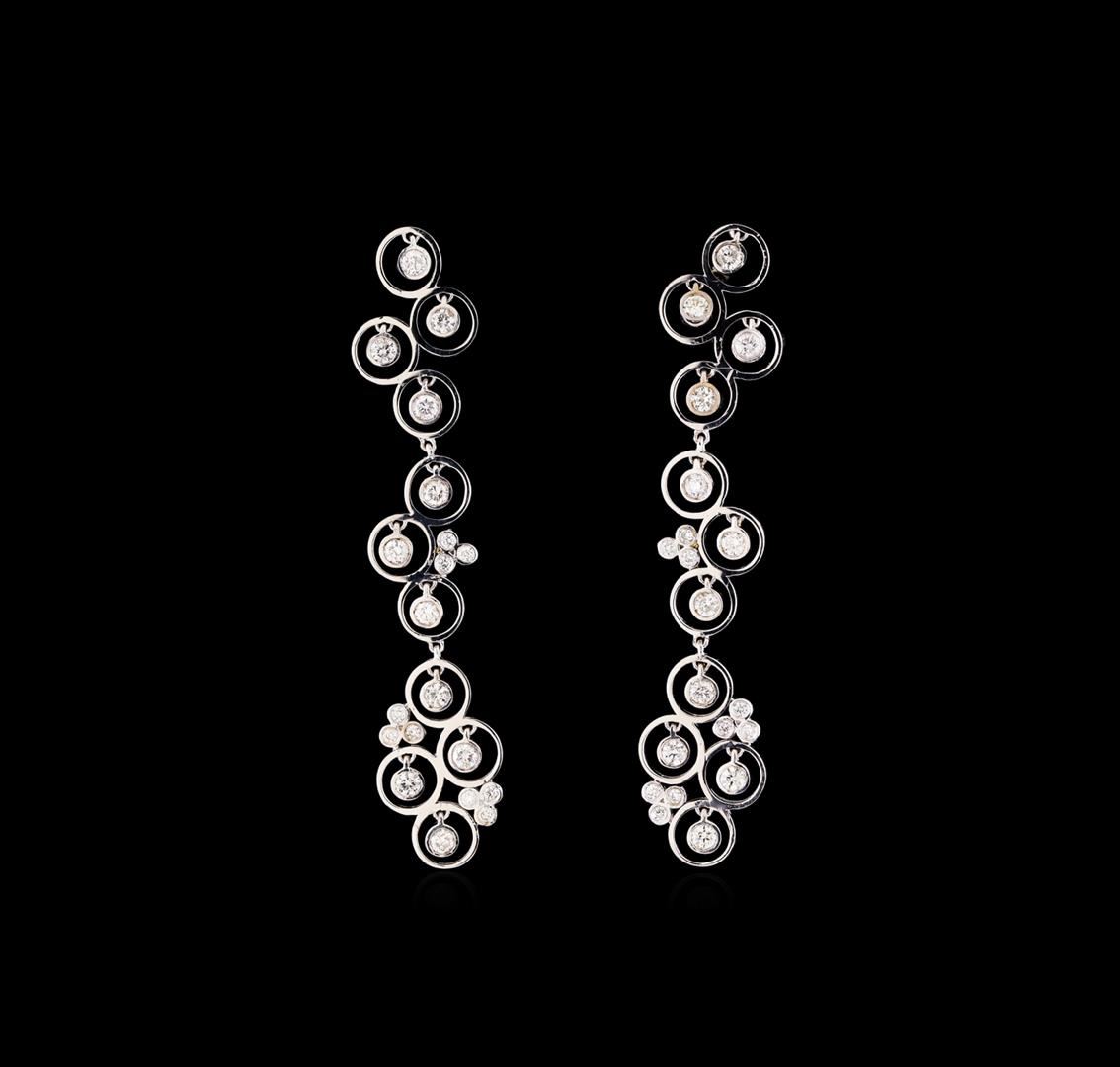 One pair electronically tested 14KT white gold ladies combination cast & assembled diamond dangle earrings with friction posts with a bright polish finish. Identified with markings of "14K". Condition is new. Containing: Forty prong set round brilliant cut diamonds, measuring 2.10 - 1.20 x 0.99mm (depth est.) approximate total weight of 40 Stones = 0.66ct. . Clarity: SI-2 to I-1. Color: I - J, Cut is Good. All diamonds are graded in the mounting, unless otherwise stated. Total Weight of Diamonds 0.66ct. Total Weight of Dangle Earrings 7.30 grams. GGL Appraised at $4,020.00.
