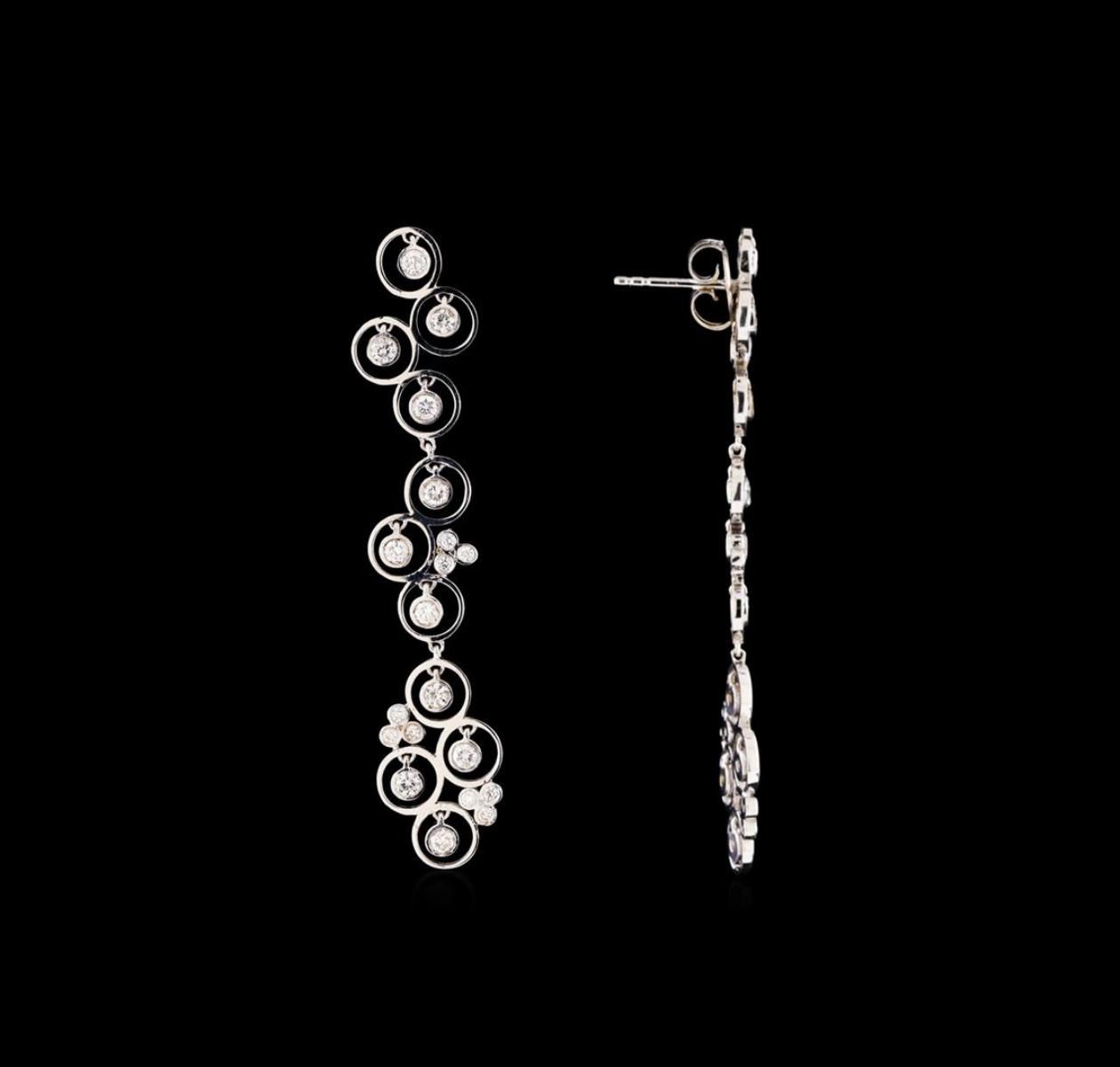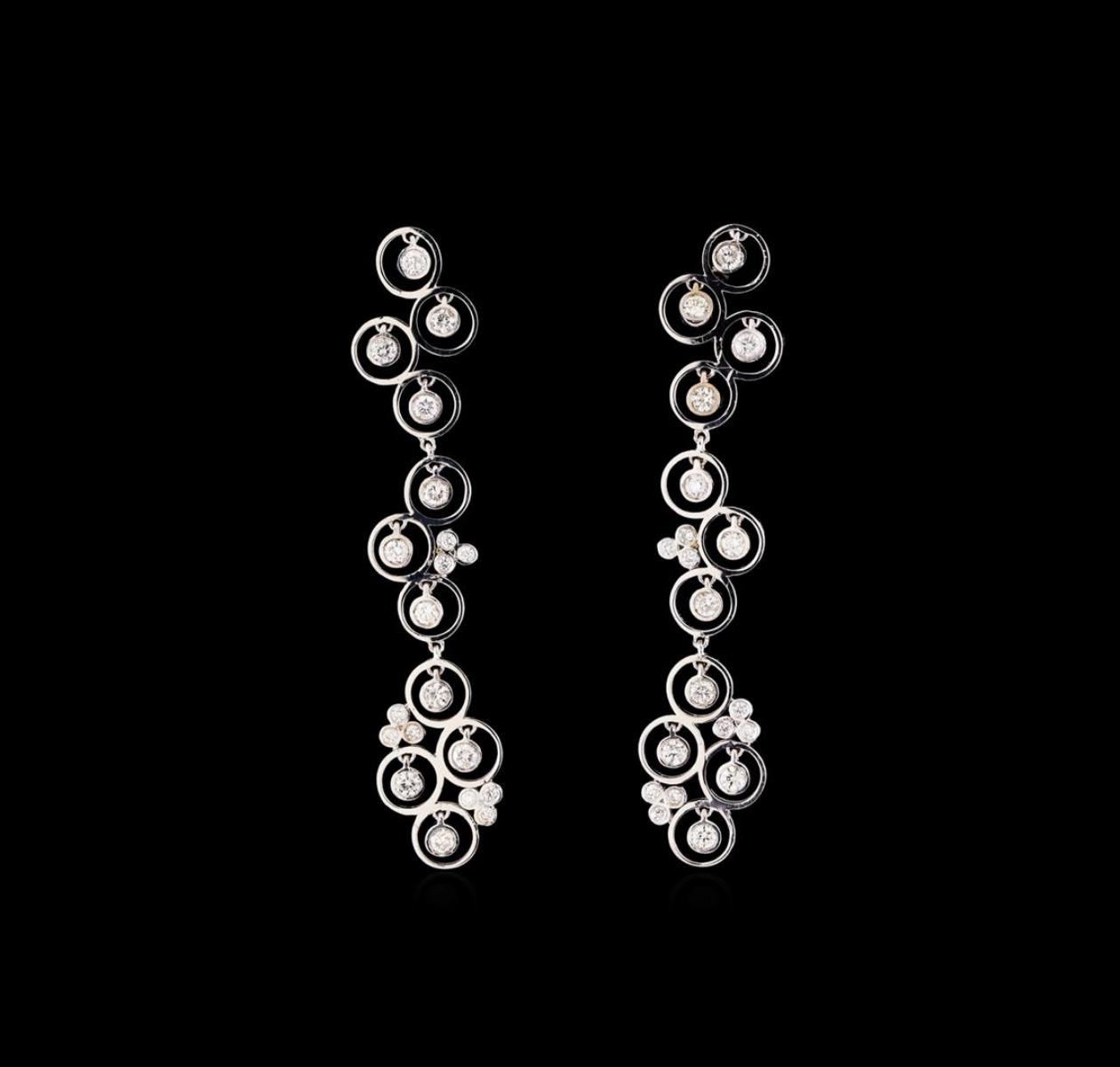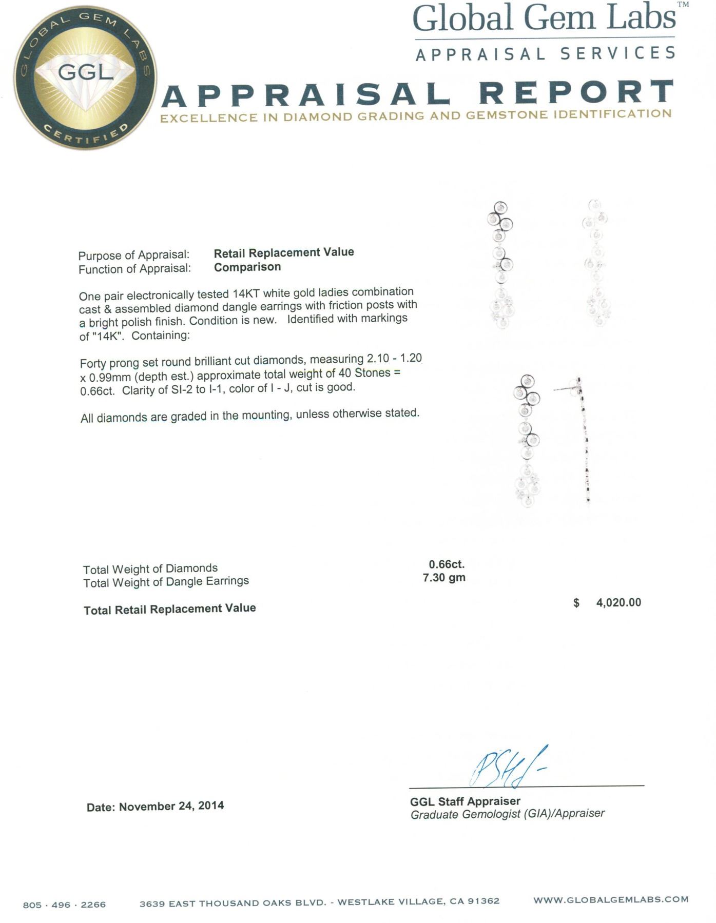 One pair electronically tested 14KT white gold ladies combination cast & assembled diamond dangle earrings with friction posts with a bright polish finish. Identified with markings of "14K". Condition is new. Containing: Forty prong set round brilliant cut diamonds, measuring 2.10 - 1.20 x 0.99mm (depth est.) approximate total weight of 40 Stones = 0.66ct. . Clarity: SI-2 to I-1. Color: I - J, Cut is Good. All diamonds are graded in the mounting, unless otherwise stated. Total Weight of Diamonds 0.66ct. Total Weight of Dangle Earrings 7.30 grams. GGL Appraised.