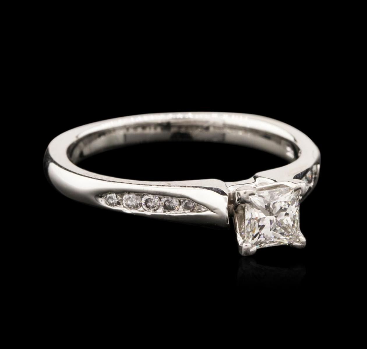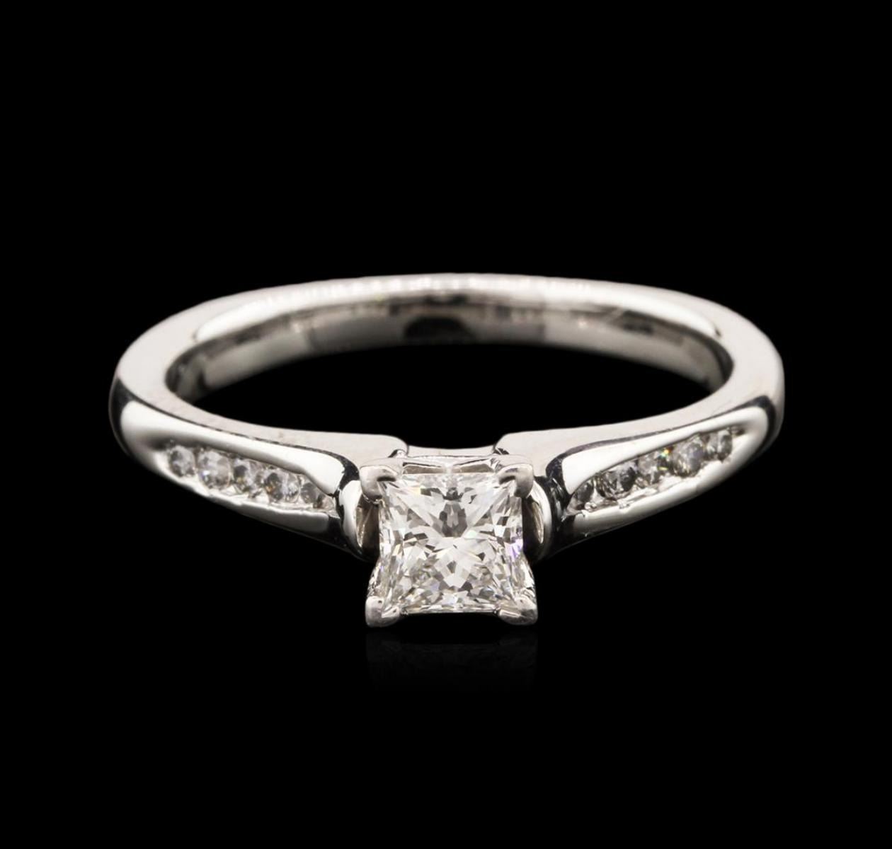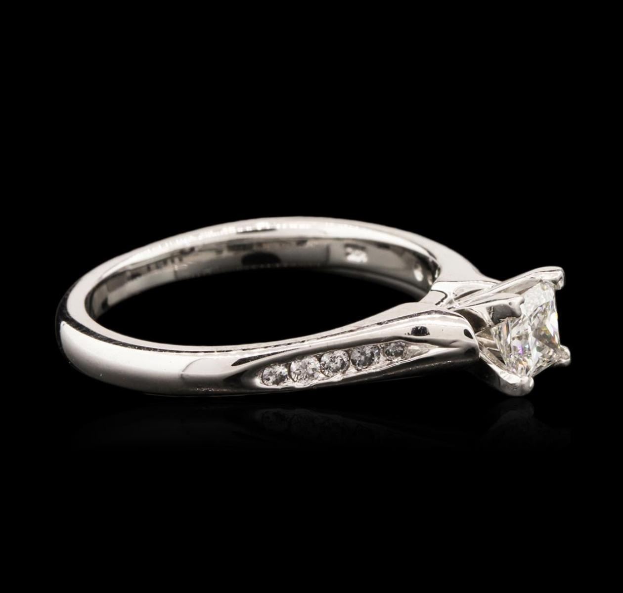 One electronically tested 14KT white gold ladies cast diamond engagement ring with a half round shank with a bright polish finish. Identified with markings of "14K". Condition is new. Containing: One prong set princess cut diamond, measuring 4.59 x 4.51 x 3.39mm (depth est.) approximate weight of 0.58ct. Clarity: VS-2. Color: I, Cut is Good. Ten prong set round brilliant cut diamonds, measuring 1.40 - 1.20 x 0.78mm (depth est.) approximate total weight of 10 Stones = 0.08ct. Clarity: SI-1 to SI-2. Color: I - J, Cut is Good. All diamonds are graded in the mounting, unless otherwise stated. Total Weight of Diamonds 0.66ct. Total Weight of Engagement Ring 4.60 grams. GGL Appraised.