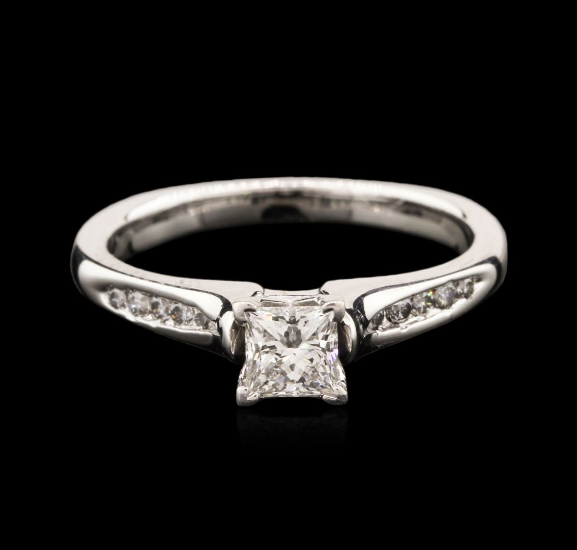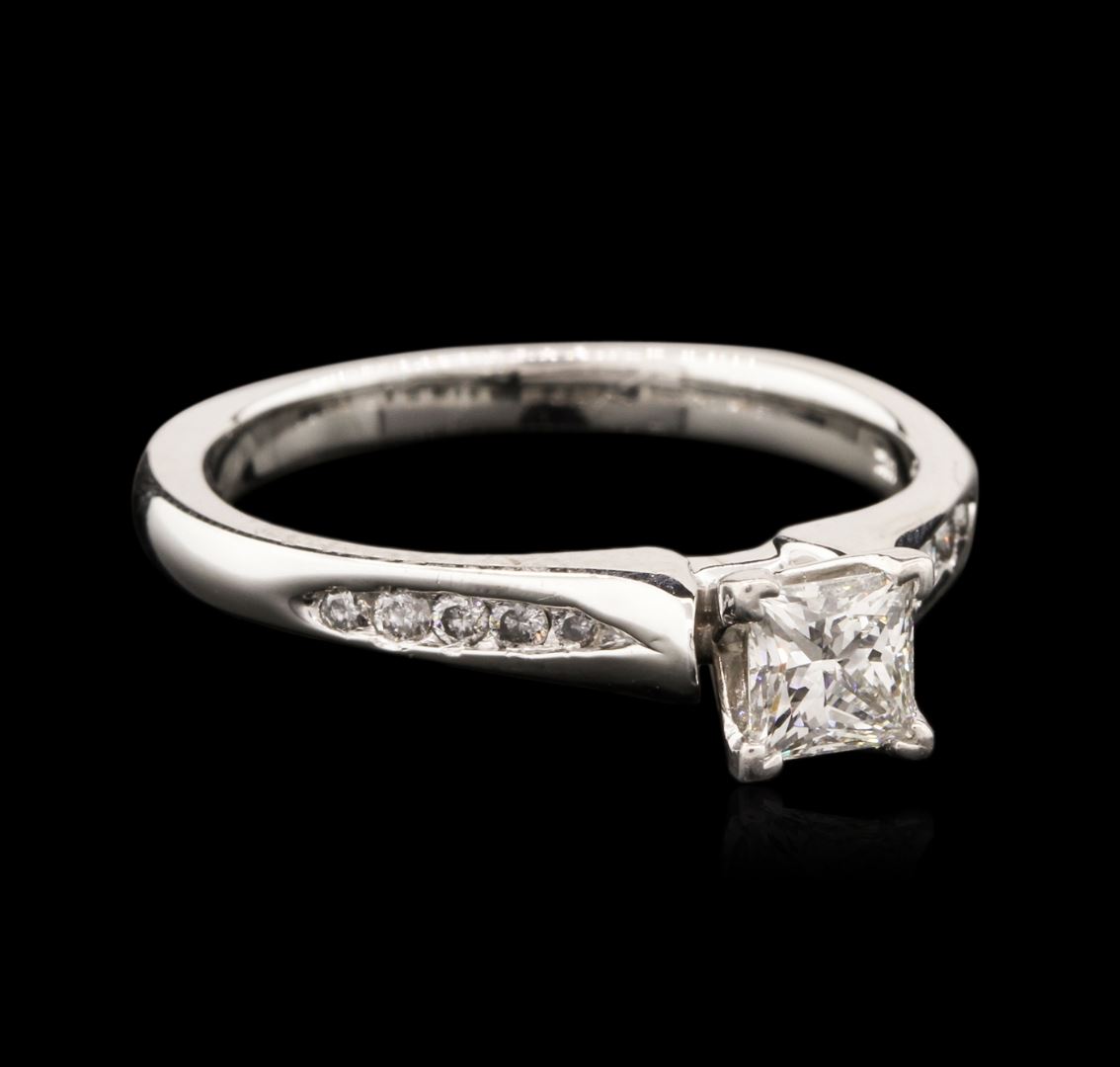 One electronically tested 14KT white gold ladies cast diamond engagement ring with a half round shank with a bright polish finish. Identified with markings of "14K". Condition is new. Containing: One prong set princess cut diamond, measuring 4.59 x 4.51 x 3.39mm (depth est.) approximate weight of 0.58ct. Clarity: VS-2. Color: I, Cut is Good. Ten prong set round brilliant cut diamonds, measuring 1.40 - 1.20 x 0.78mm (depth est.) approximate total weight of 10 Stones = 0.08ct. Clarity: SI-1 to SI-2. Color: I - J, Cut is Good. All diamonds are graded in the mounting, unless otherwise stated. Total Weight of Diamonds 0.66ct. Total Weight of Engagement Ring 4.60 grams. GGL Appraised at $4,165.00.