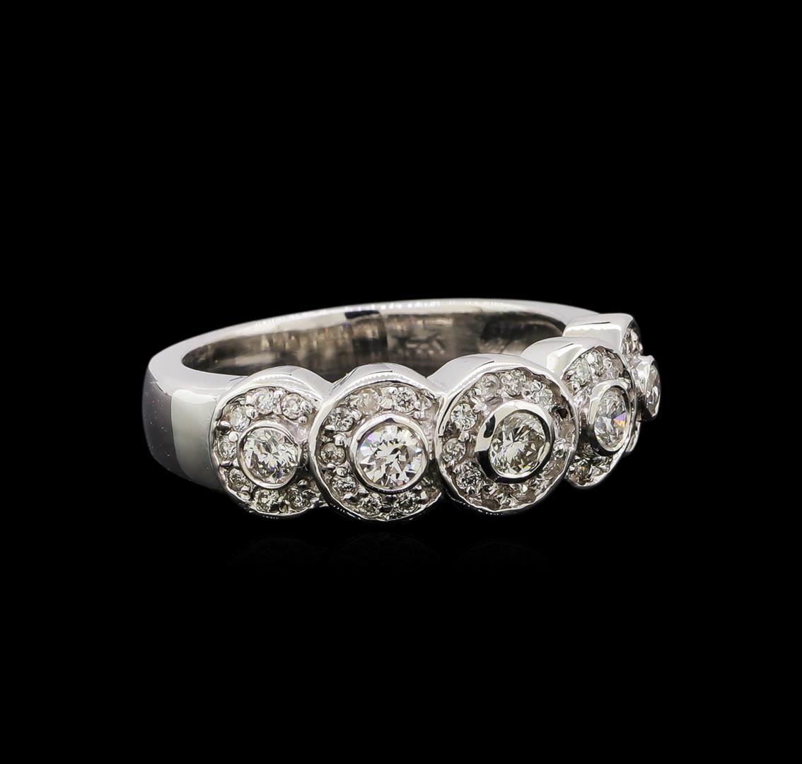 One electronically tested 14KT white gold ladies cast diamond ring with a bright polish finish. Identified with markings of "14K". Condition is new. Containing: Four bezel set round brilliant cut diamonds, measuring 2.50 - 2.50 x 1.50mm (depth est.) approximate total weight of 4 Stones = 0.30ct. Clarity: SI-2 to I-1. Color: H - I, Cut is Good. Thirty-Nine prong set round brilliant cut diamonds, measuring 1.30 - 1.30 x 0.78mm (depth est.) approximate total weight of 39 Stones = 0.37ct. Clarity: I-1 to I-2. Color: I - J, Cut is Good. Diamonds are graded in the mounting, unless otherwise stated. Total Weight of Diamonds 0.67ct. Total Weight of Ring 5.70 grams. GGL Appraised at $1,995.00.