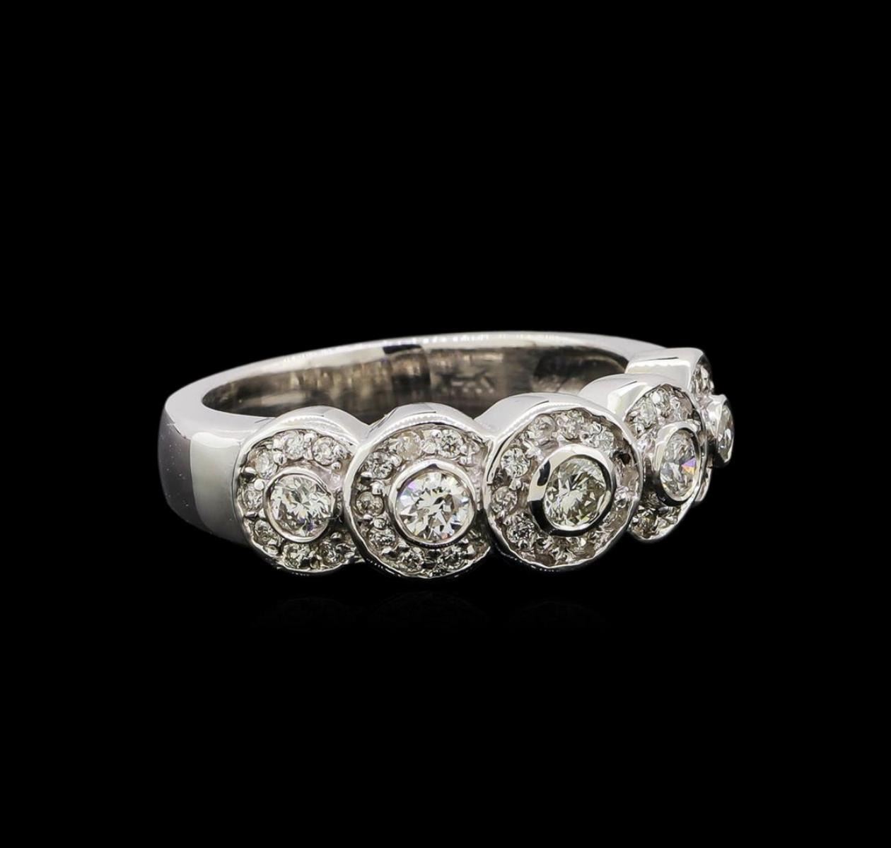 One electronically tested 14KT white gold ladies cast diamond ring with a bright polish finish. Identified with markings of "14K". Condition is new. Containing: Four bezel set round brilliant cut diamonds, measuring 2.50 - 2.50 x 1.50mm (depth est.) approximate total weight of 4 Stones = 0.30ct. Clarity: SI-2 to I-1. Color: H - I, Cut is Good. Thirty-Nine prong set round brilliant cut diamonds, measuring 1.30 - 1.30 x 0.78mm (depth est.) approximate total weight of 39 Stones = 0.37ct. Clarity: I-1 to I-2. Color: I - J, Cut is Good. Diamonds are graded in the mounting, unless otherwise stated. Total Weight of Diamonds 0.67ct. Total Weight of Ring 5.70 grams. GGL Appraised.