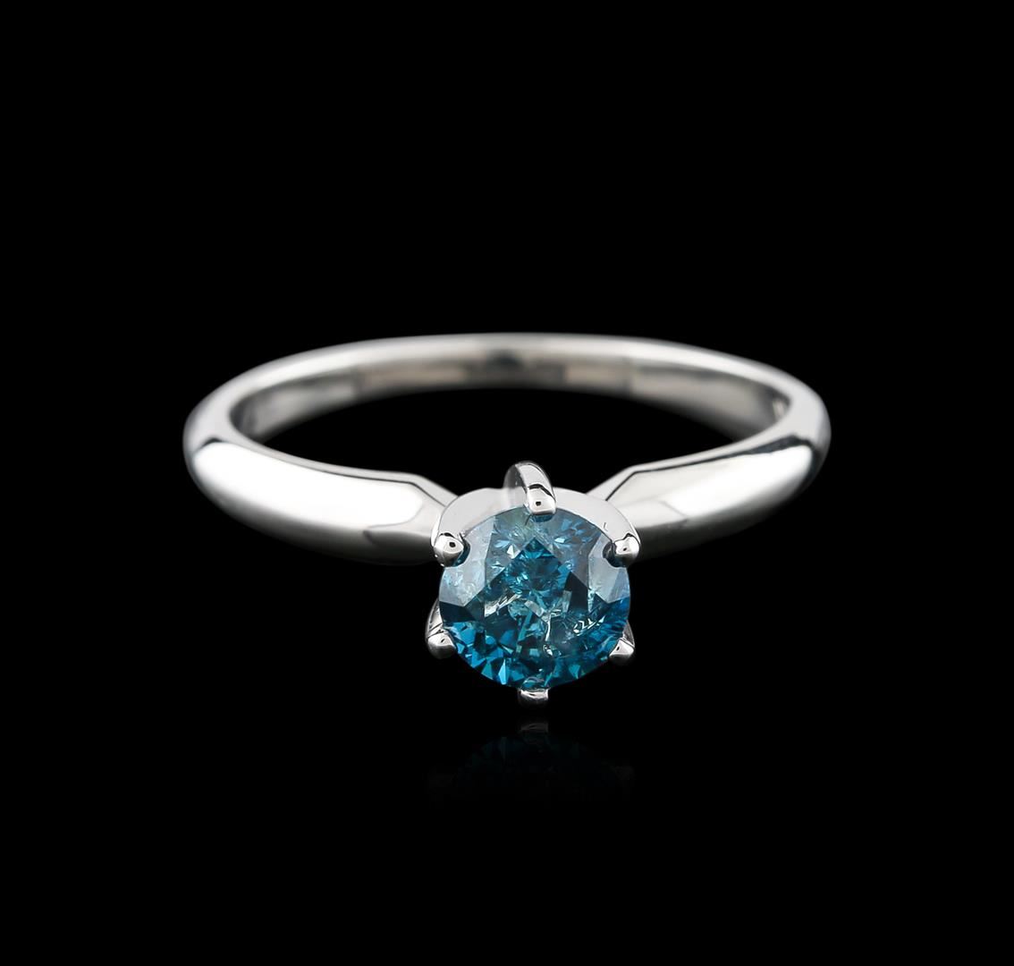 One electronically tested 14KT white gold ladies cast diamond solitaire ring with a half round shank with a bright polish finish. Identified with markings of "14K". Condition is new. Containing: One prong set round brilliant cut diamond, measuring 5.39 - 5.36 x 3.50mm (depth est.) exact weight 0.67ct. Clarity: I-2, Cut is Good. Color of the stone has been treated. Diamonds are graded in the mounting, unless otherwise stated. Total Weight of Diamonds 0.67ct. Total Weight of Solitaire Ring 2.30 grams. GGL Appraised at $1,615.00.