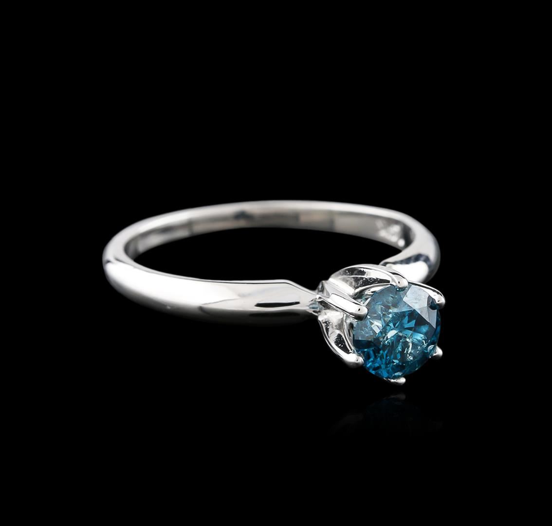One electronically tested 14KT white gold ladies cast diamond solitaire ring with a half round shank with a bright polish finish. Identified with markings of "14K". Condition is new. Containing: One prong set round brilliant cut diamond, measuring 5.39 - 5.36 x 3.50mm (depth est.) exact weight 0.67ct. Clarity: I-2, Cut is Good. Color of the stone has been treated. Diamonds are graded in the mounting, unless otherwise stated. Total Weight of Diamonds 0.67ct. Total Weight of Solitaire Ring 2.30 grams. GGL Appraised at $1,615.00.