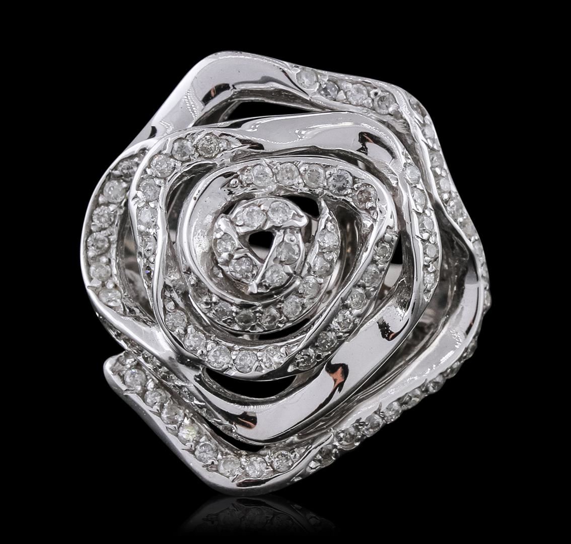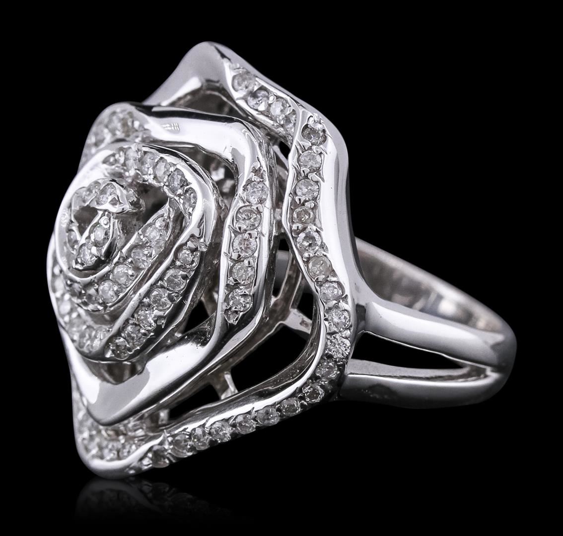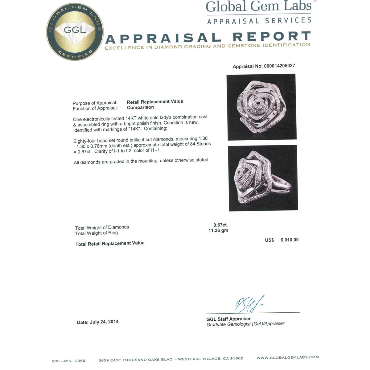 One electronically tested 14KT white gold ladies combination cast & assembled ring with a bright polish finish. Condition is new. Identified with markings of "14K". Containing: Eighty-Four bead set round brilliant cut diamonds, measuring 1.30 - 1.30 x 0.78mm (depth est.) approximate total weight of 84 Stones = 0.67ct. Clarity: I-1 to I-3. Color: H - I. All diamonds are graded in the mounting, unless otherwise stated. Total Weight of Diamonds 0.67ct. Total Weight of Ring 11.36 grams. GGL Appraised at $6,910.00.