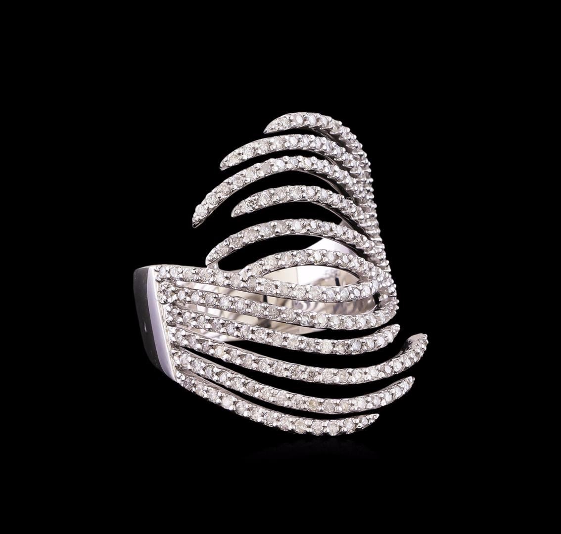 One electronically tested 14KT white gold ladies cast diamond ring with a bright polish finish. Identified with markings of "585". Condition is new. Containing: One Hundred Ninety prong set round brilliant cut diamonds, measuring 1.00 - 1.00 x 0.60mm (depth est.) approximate total weight of 190 Stones = 0.68ct. Clarity: SI-2 to I-1. Color: I - J, Cut is Good. All diamonds are graded in the mounting, unless otherwise stated. Total Weight of Diamonds 0.68ct. Total Weight of Ring 9.20 grams. GGL Appraised at $4,285.00.