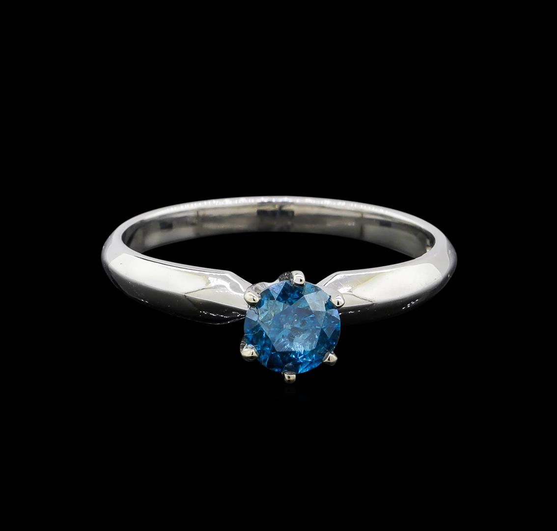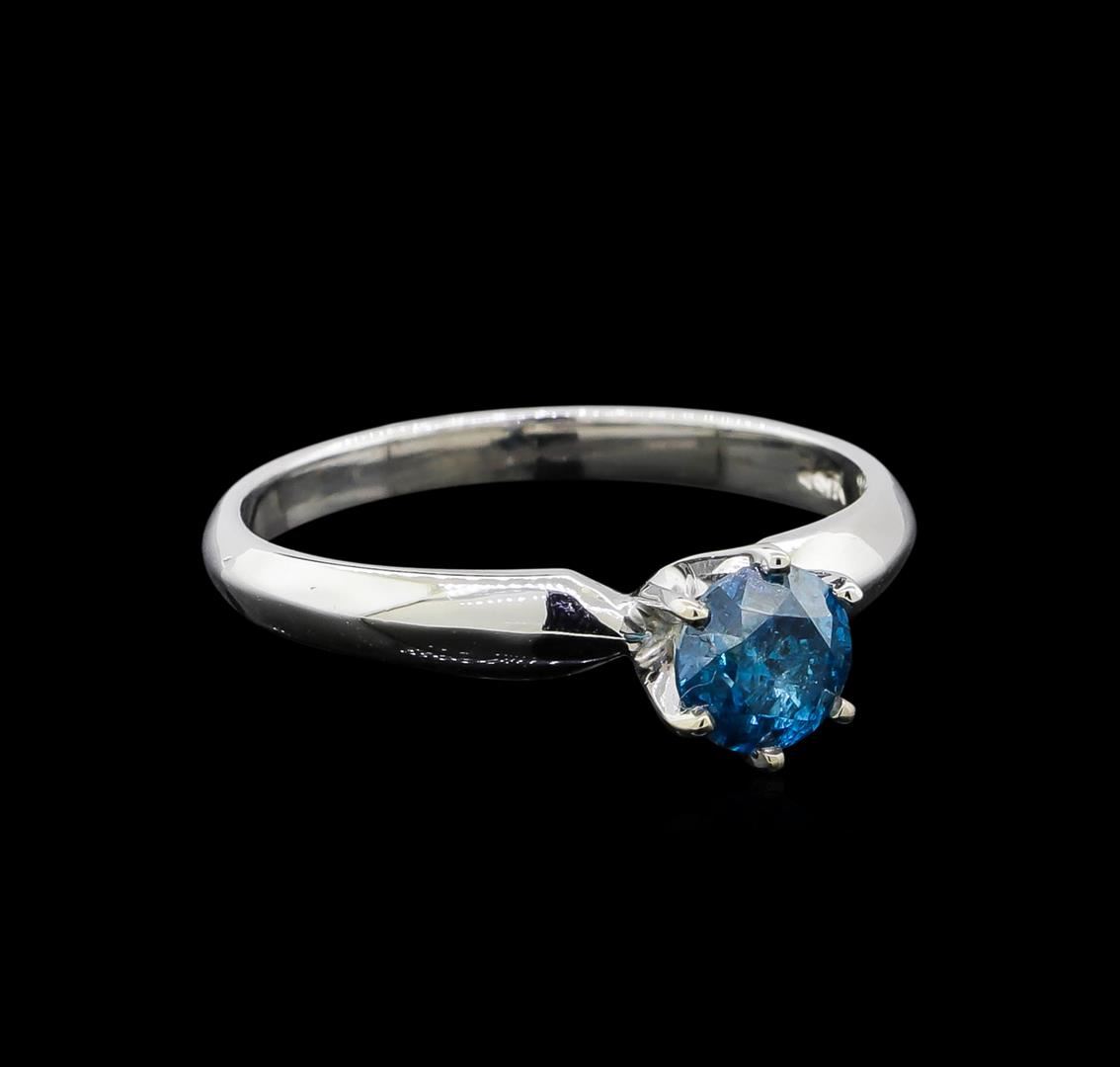 One electronically tested 14KT white gold ladies cast diamond solitaire ring with a half round shank with a bright polish finish. Identified with markings of "14K". Condition is new. Containing: One prong set round brilliant cut diamond, measuring 5.40 - 5.40 x 3.51mm (depth est.) exact weight 0.68ct. Clarity: I-2, Cut is Good. Color of the stone has been treated. Diamonds are graded in the mounting, unless otherwise stated. Total Weight of Diamonds 0.68ct. Total Weight of Solitaire Ring 2.40 grams. GGL Appraised at $1,575.00.