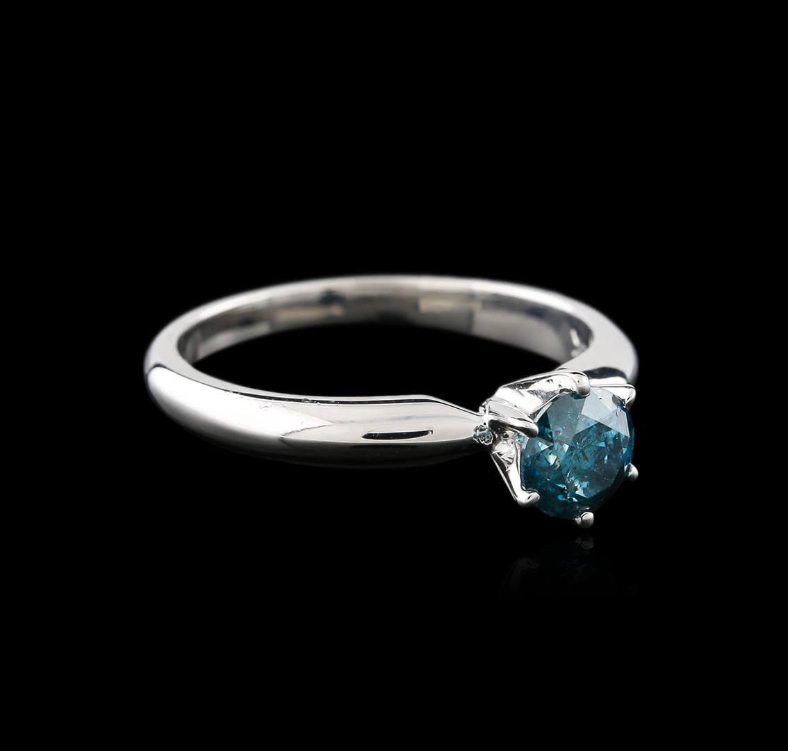 One electronically tested 14KT white gold ladies cast diamond solitaire ring with a knife edge shank with a bright polish finish. Identified with markings of "14K". Condition is new. Containing: One prong set round brilliant cut diamond, measuring 5.50 - 5.50 x 3.57mm (depth est.) exact weight 0.68ct. Clarity: I-2, Cut is Good. Color of the stone has been treated. Diamonds are graded in the mounting, unless otherwise stated. Total Weight of Diamonds 0.68ct. Total Weight of Solitaire Ring 2.80 grams. GGL Appraised at $1,570.00.