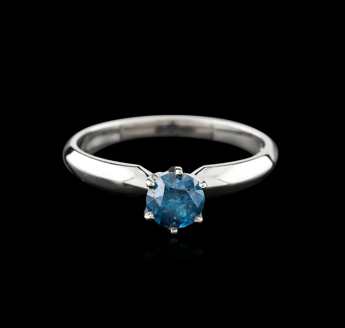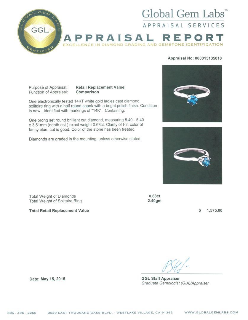 One electronically tested 14KT white gold ladies cast diamond solitaire ring with a half round shank with a bright polish finish. Identified with markings of "14K". Condition is new. Containing: One prong set round brilliant cut diamond, measuring 5.40 - 5.40 x 3.51mm (depth est.) exact weight 0.68ct. Clarity: I-2, Cut is Good. Color of the stone has been treated. Diamonds are graded in the mounting, unless otherwise stated. Total Weight of Diamonds 0.68ct. Total Weight of Solitaire Ring 2.40 grams. GGL Appraised at $1,575.00.