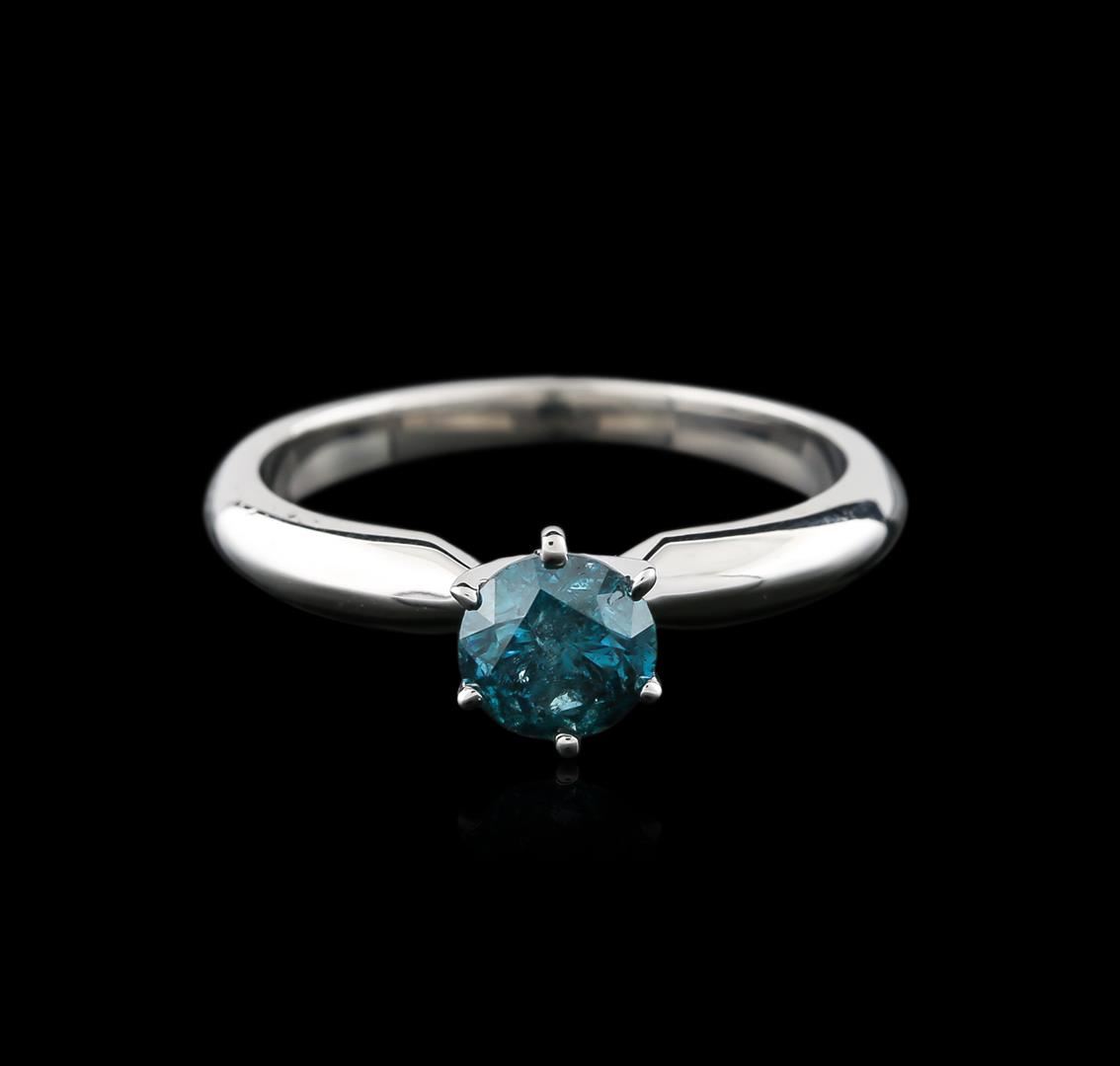 One electronically tested 14KT white gold ladies cast diamond solitaire ring with a knife edge shank with a bright polish finish. Identified with markings of "14K". Condition is new. Containing: One prong set round brilliant cut diamond, measuring 5.50 - 5.50 x 3.57mm (depth est.) exact weight 0.68ct. Clarity: I-2, Cut is Good. Color of the stone has been treated. Diamonds are graded in the mounting, unless otherwise stated. Total Weight of Diamonds 0.68ct. Total Weight of Solitaire Ring 2.80 grams. GGL Appraised at $1,570.00.