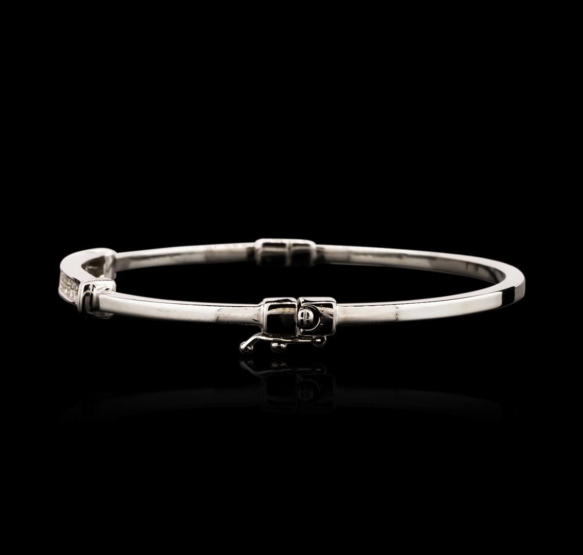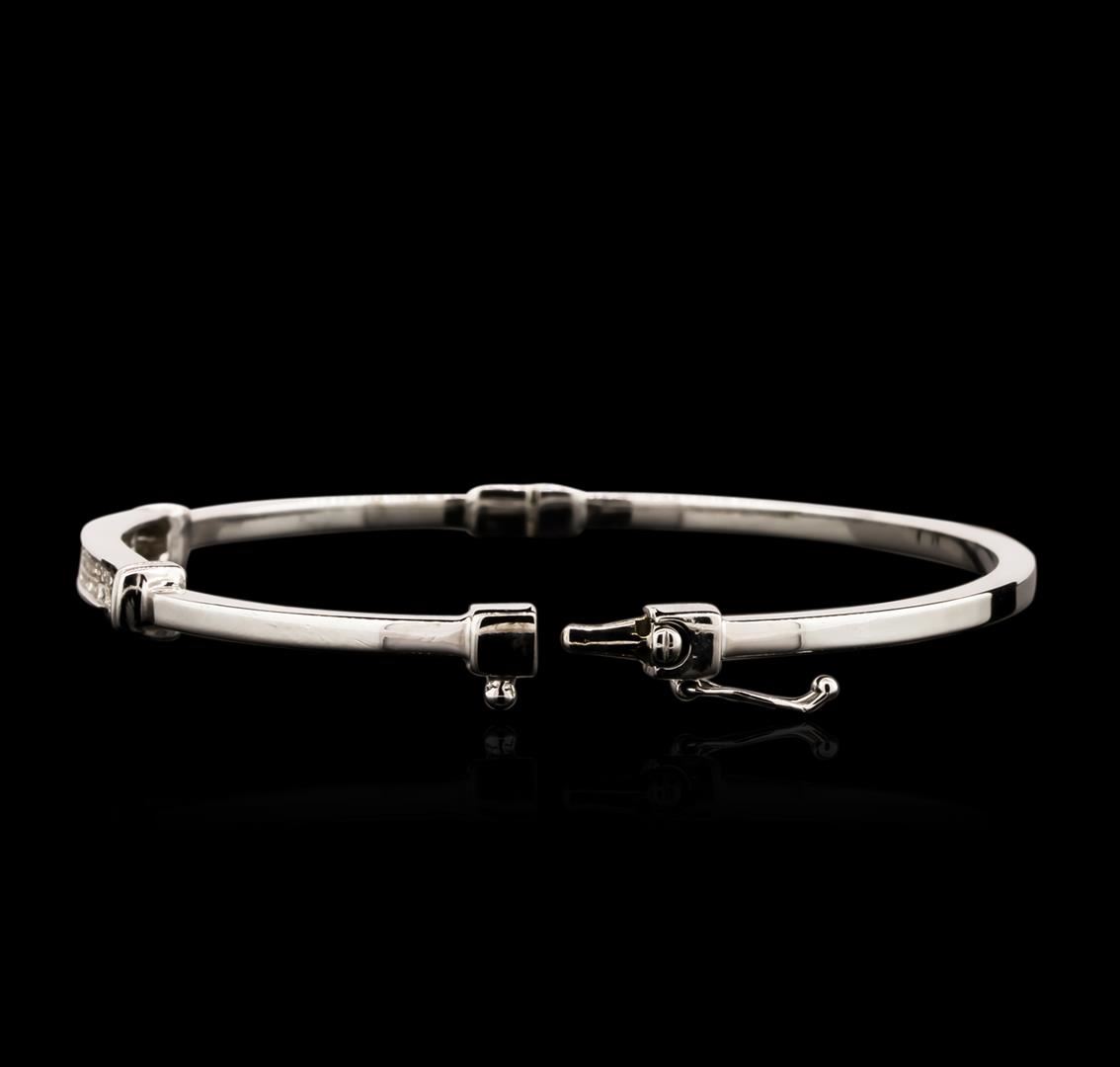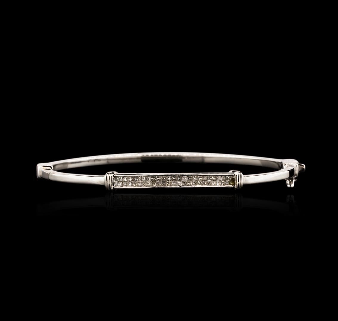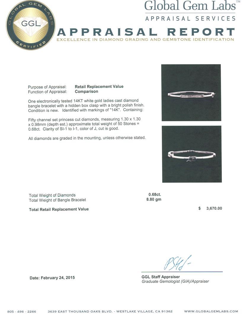 One electronically tested 14KT white gold ladies cast diamond bangle bracelet with a hidden box clasp with a bright polish finish. Identified with markings of "14K". Condition is new. Containing: Fifty channel set princess cut diamonds, measuring 1.30 x 1.30 x 0.98mm (depth est.) approximate total weight of 50 Stones = 0.68ct. Clarity: SI-1 to I-1. Color: J, Cut is Good. All diamonds are graded in the mounting, unless otherwise stated. Total Weight of Diamonds 0.68ct. Total Weight of Bangle Bracelet 8.80 grams. GGL Appraised at $3,670.00.