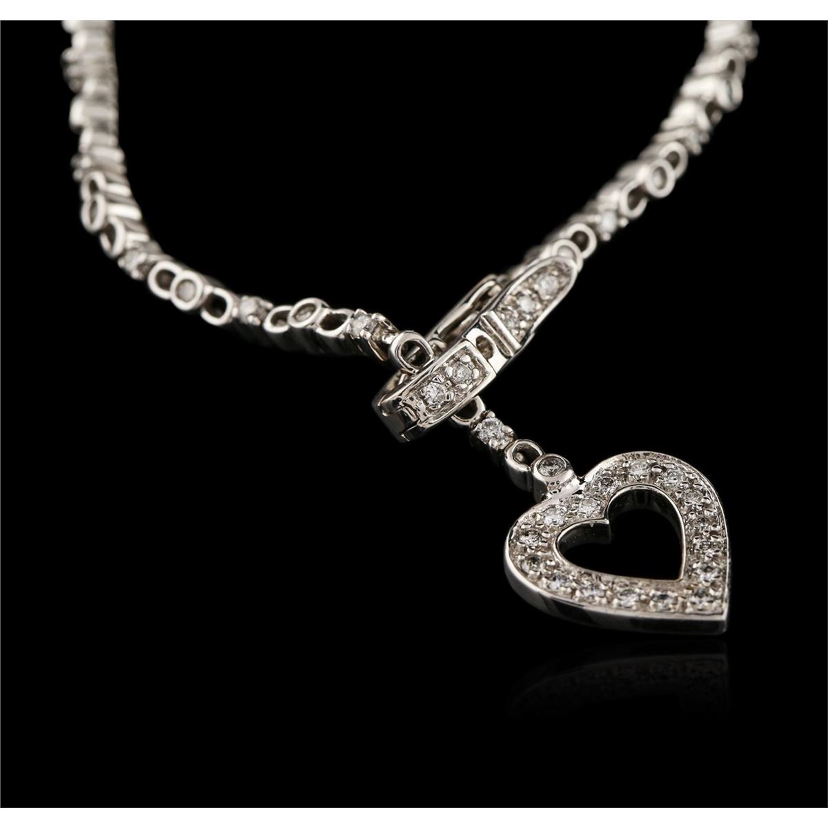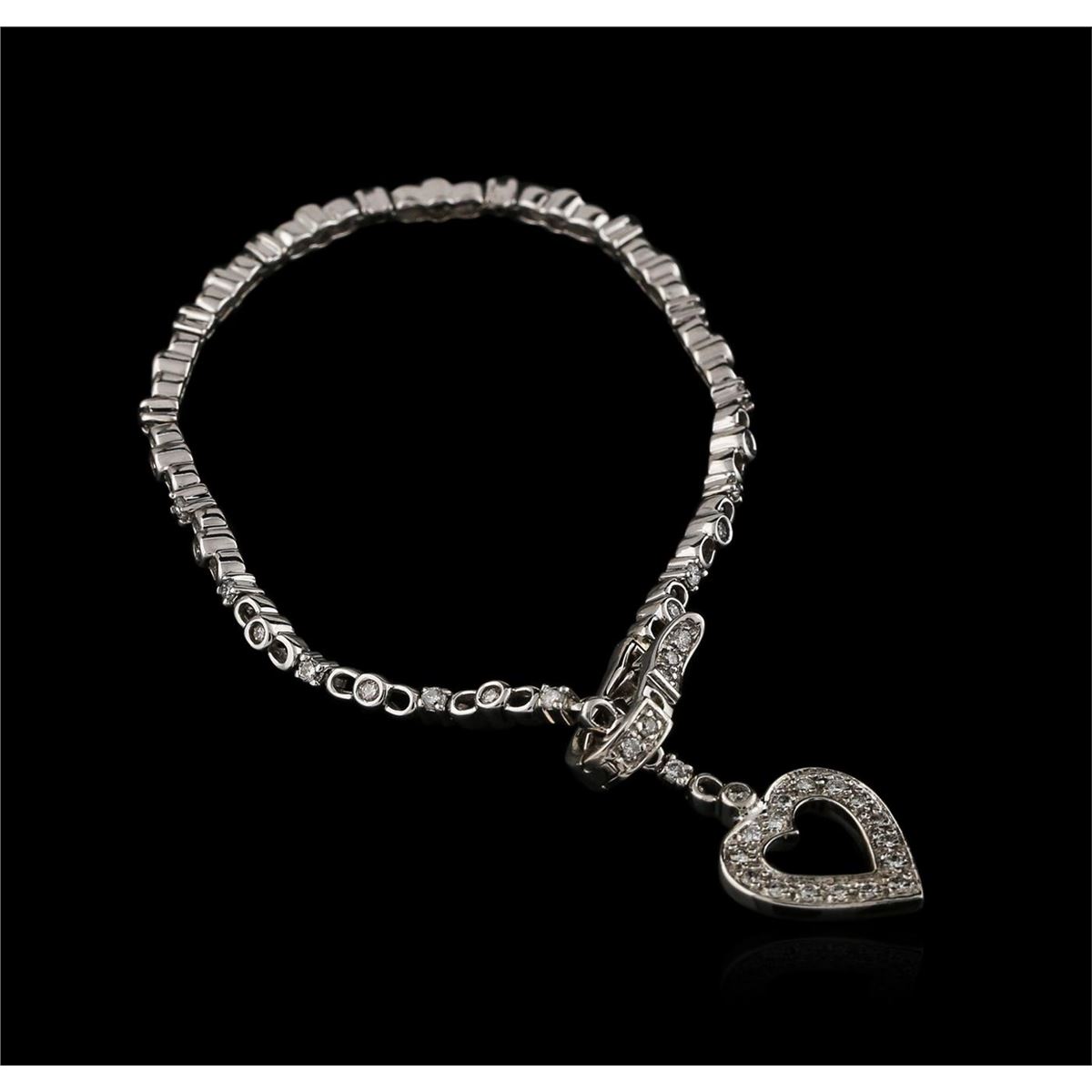 One electronically tested 14KT white gold ladies cast diamond bracelet with a foldover clasp with a bright polish finish. Measurements: 7.25" in length Condition is new. Containing: Fifty-Five bezel set round brilliant cut diamonds, measuring 1.50 - 1.50 x 0.90mm (depth est.) approximate total weight of 55 Stones = 0.68ct. Clarity: SI-2 to I-2. Color: K - L. All diamonds are graded in the mounting, unless otherwise stated. Total Weight of Diamonds 0.68ct. Total Weight of Bracelet 10.20 grams. GGL Appraised at $4,960.00.
